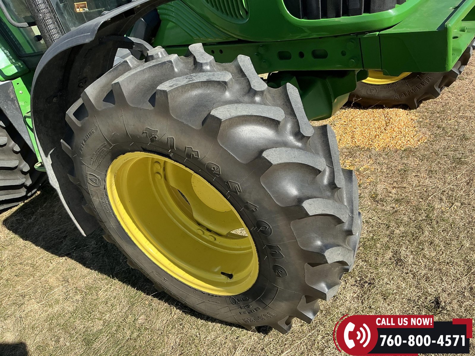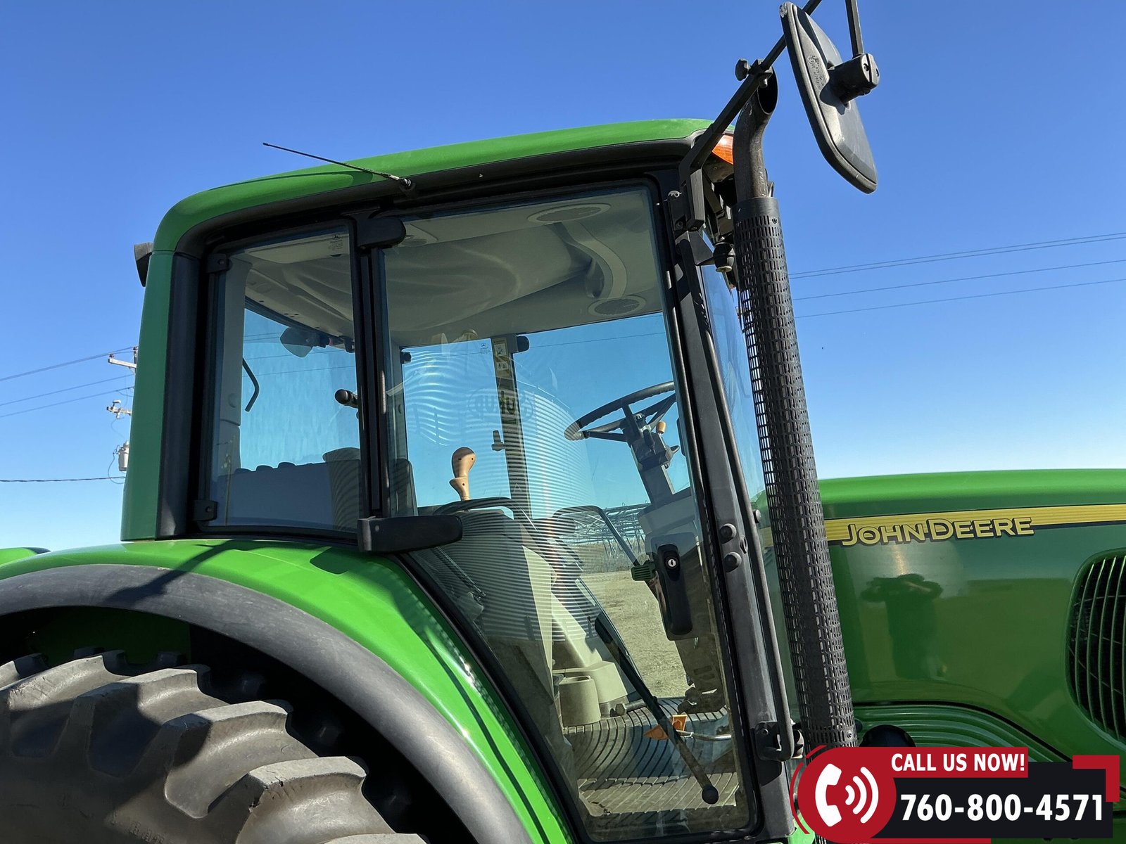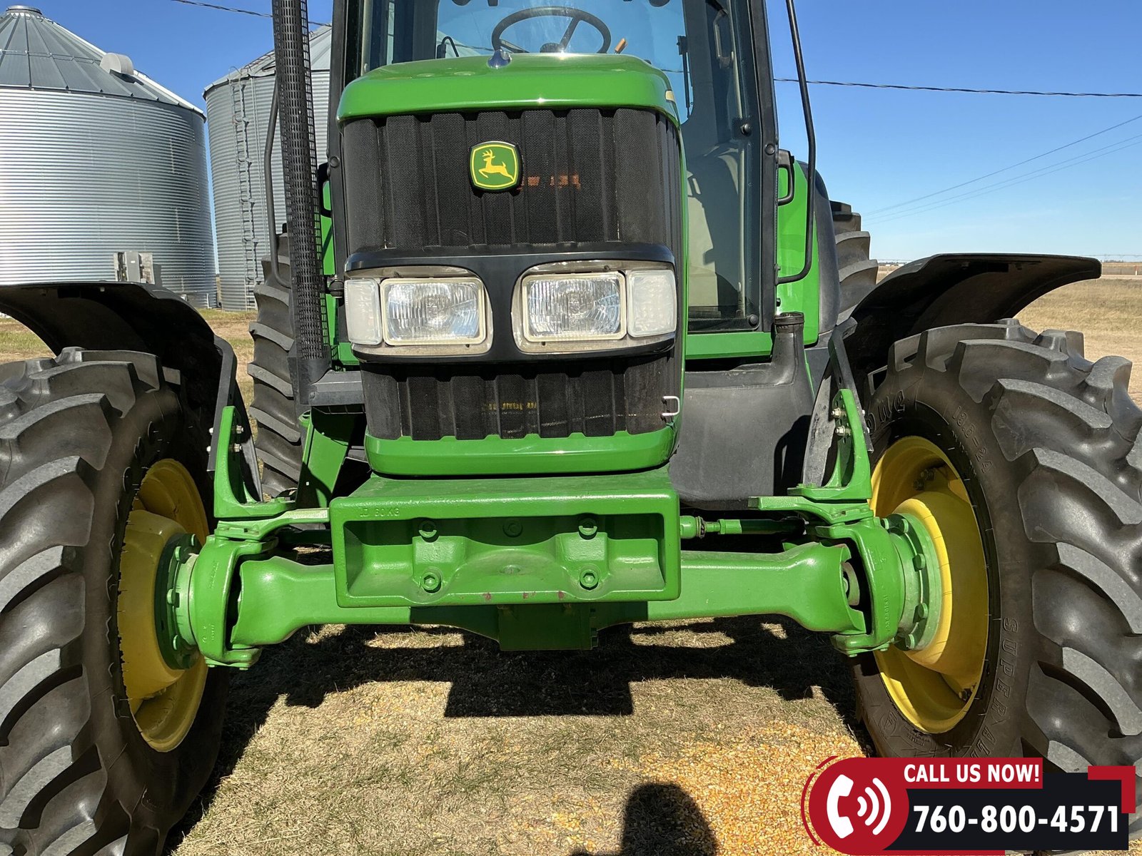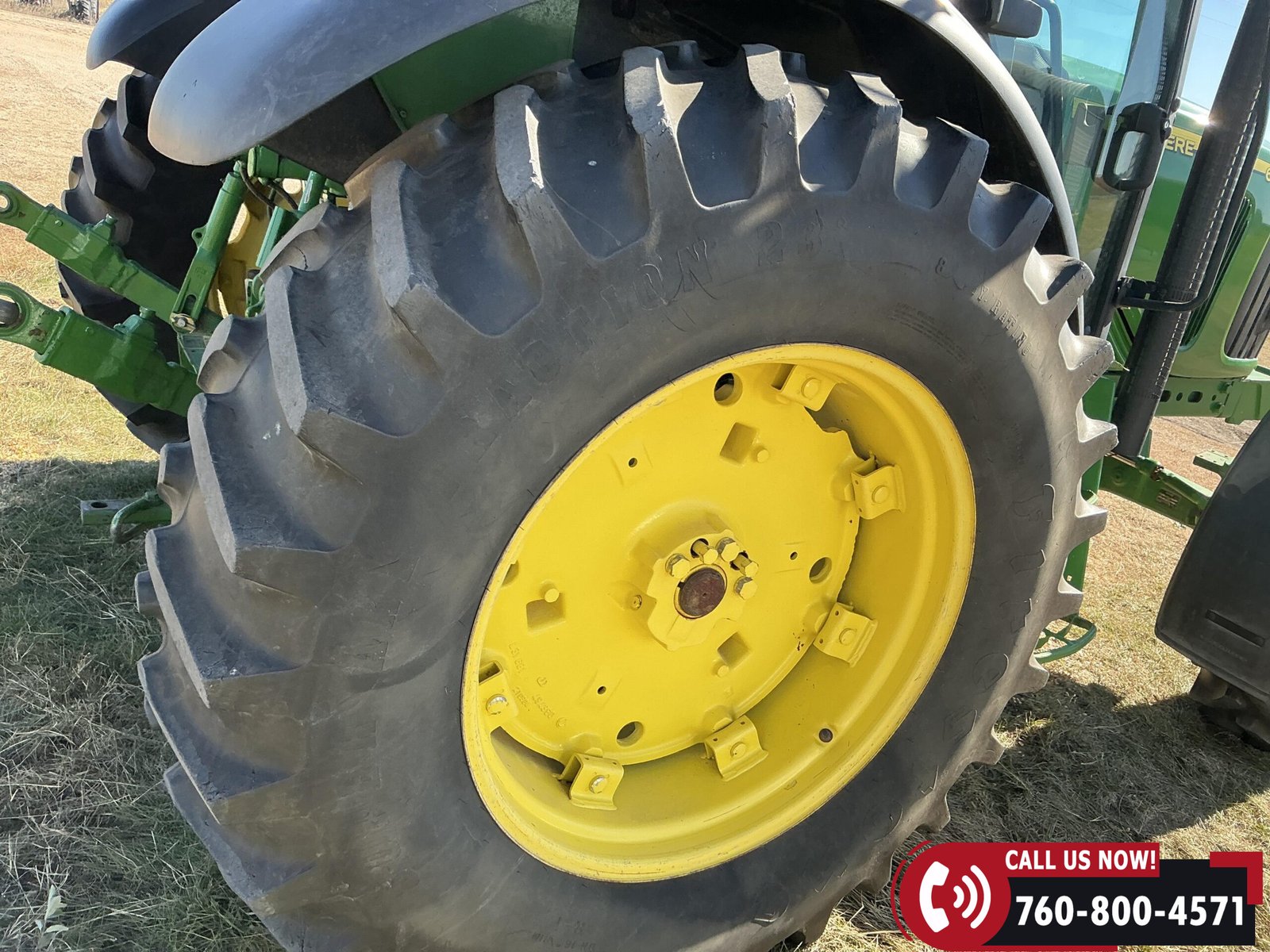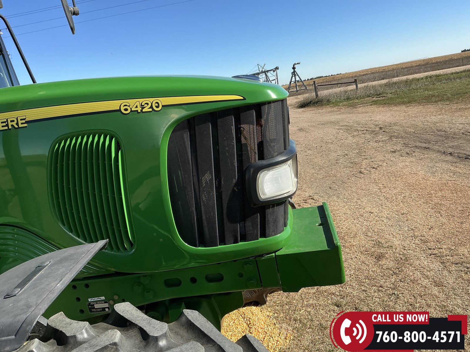 2004 John Deere 6420 MFWD Tractor with 839 hours showing. Powered by a John Deere 4.5L 4-cylinder water-cooled diesel engine. Equipped with a 24-speed partial PowerShift transmission, MFWD (mechanical front-wheel drive), and 540 PTO. Features three auxiliary hydraulic remotes. Rides on 13.6-24 front tires and 18.4-34 rear tires.