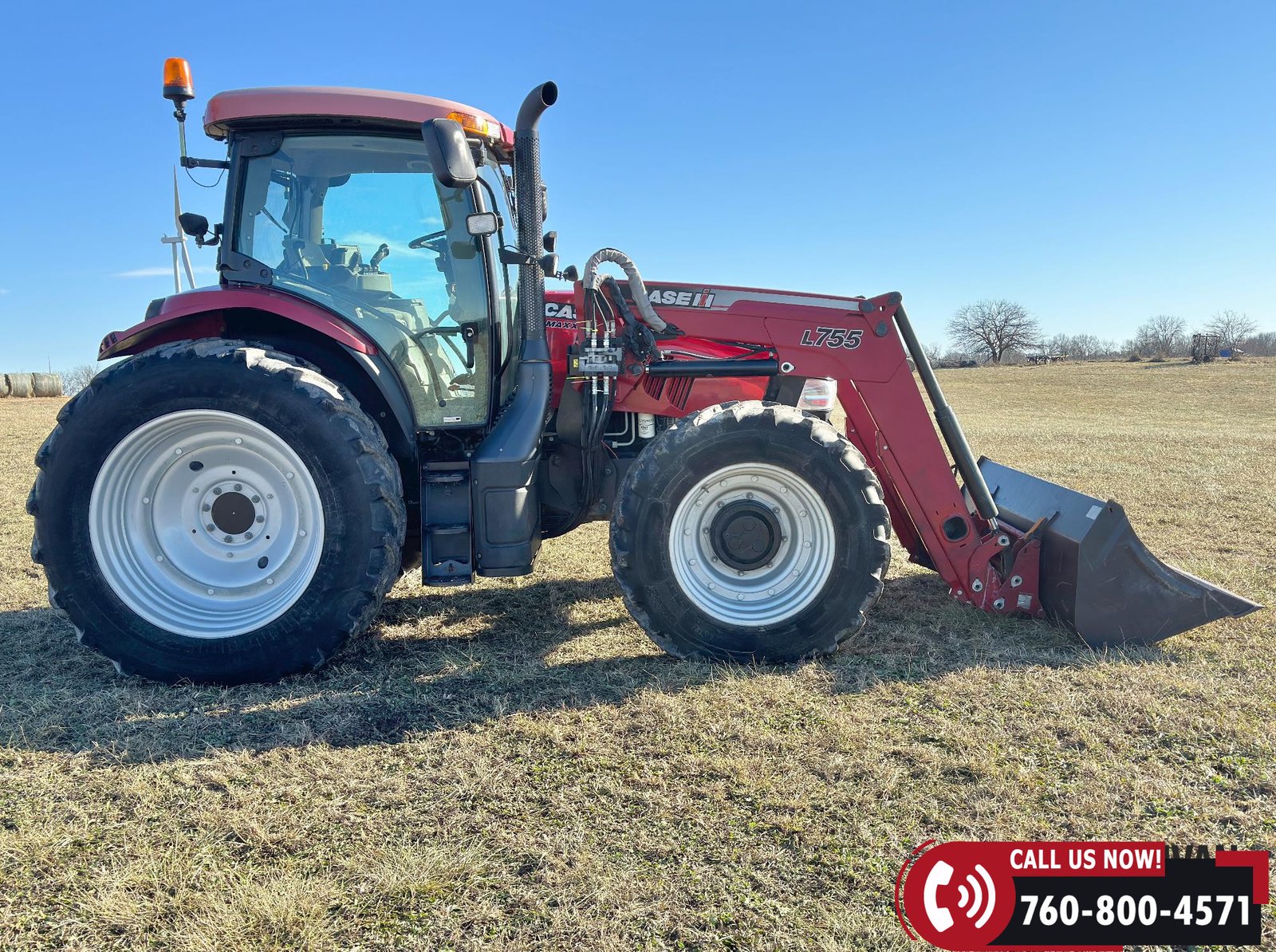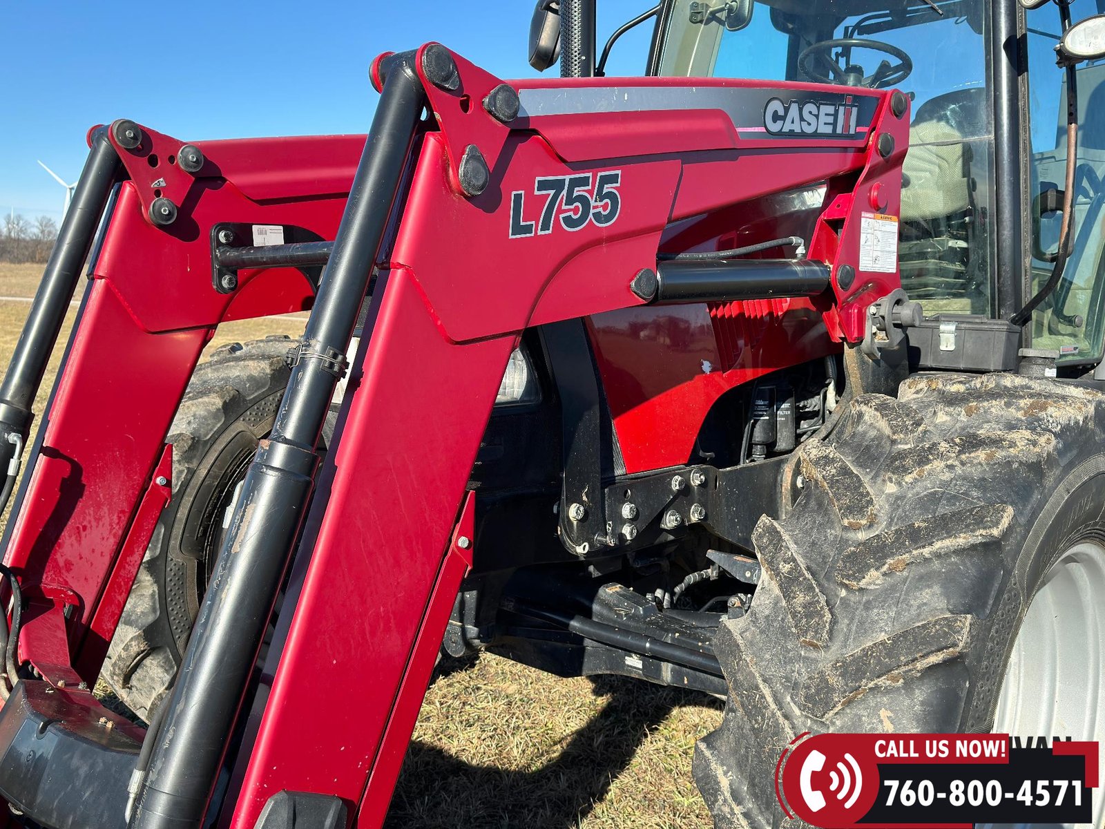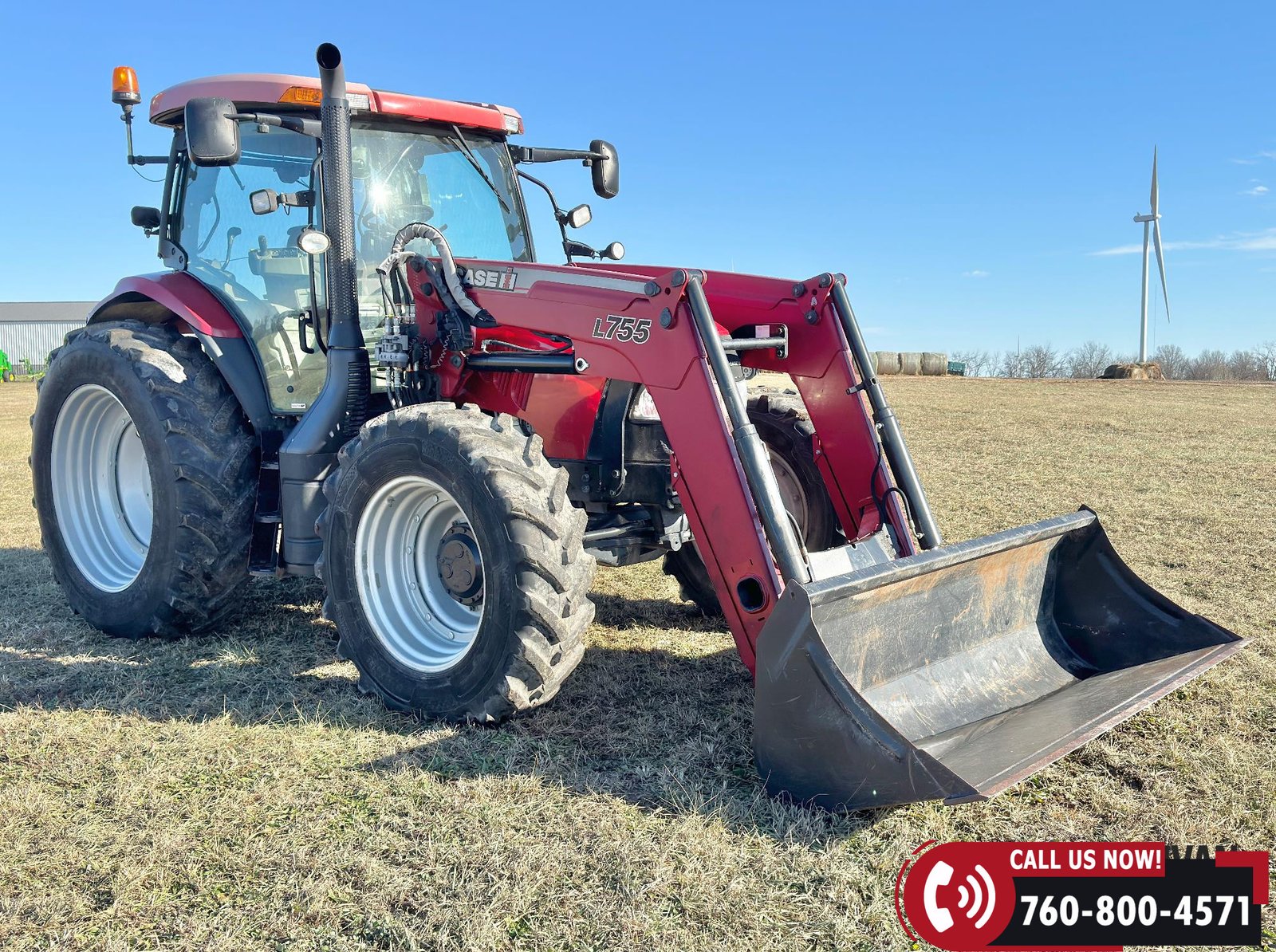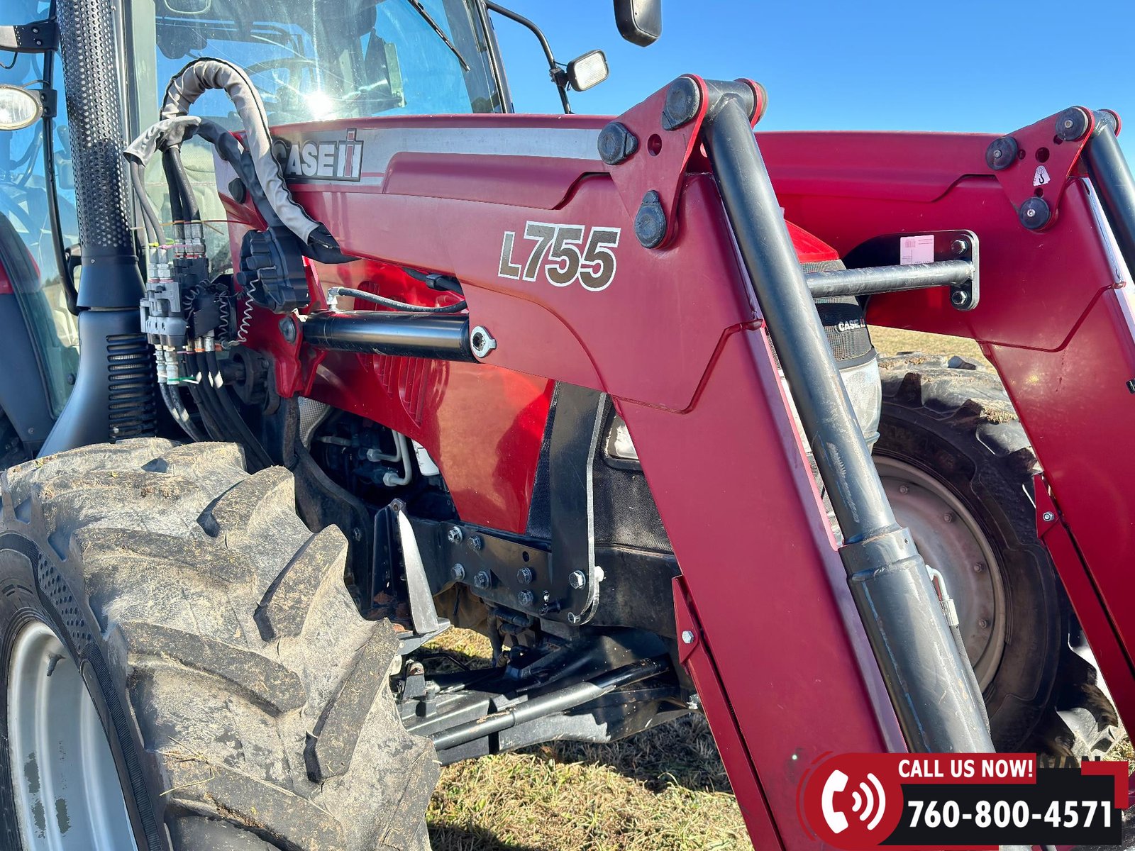 Includes a Case IH L755 loader with mid couplers, joystick control, and a 91″ material bucket with global hookup.