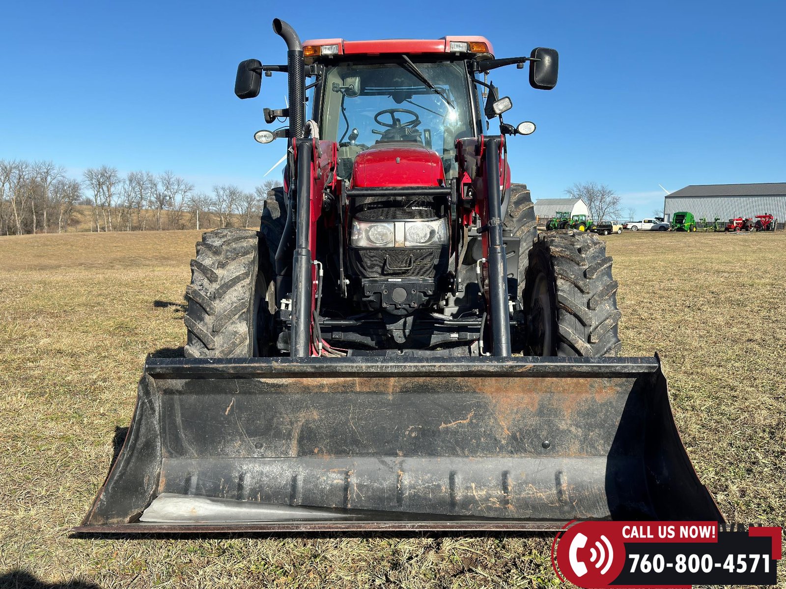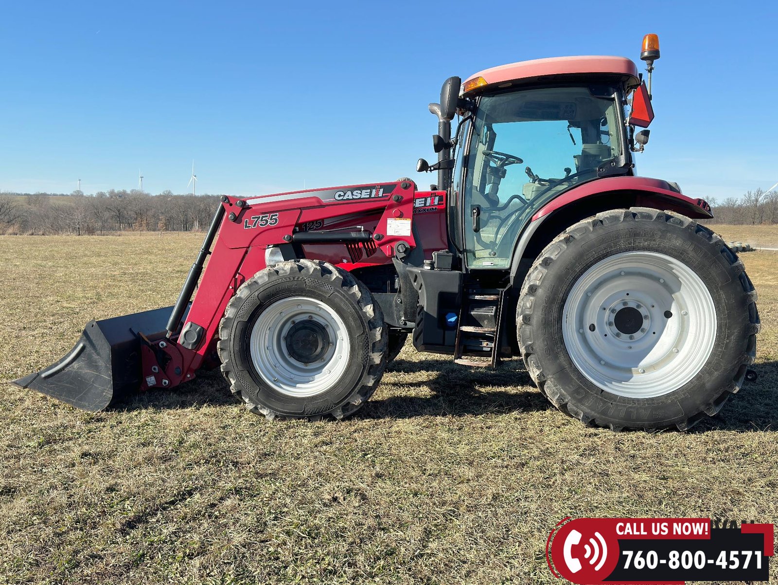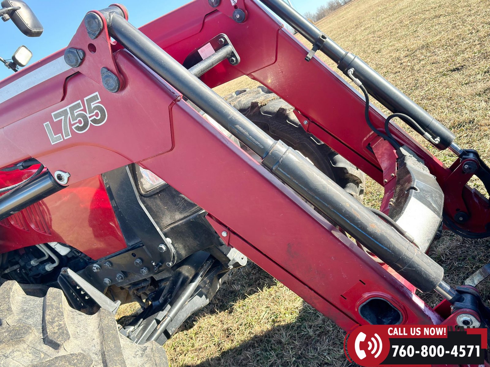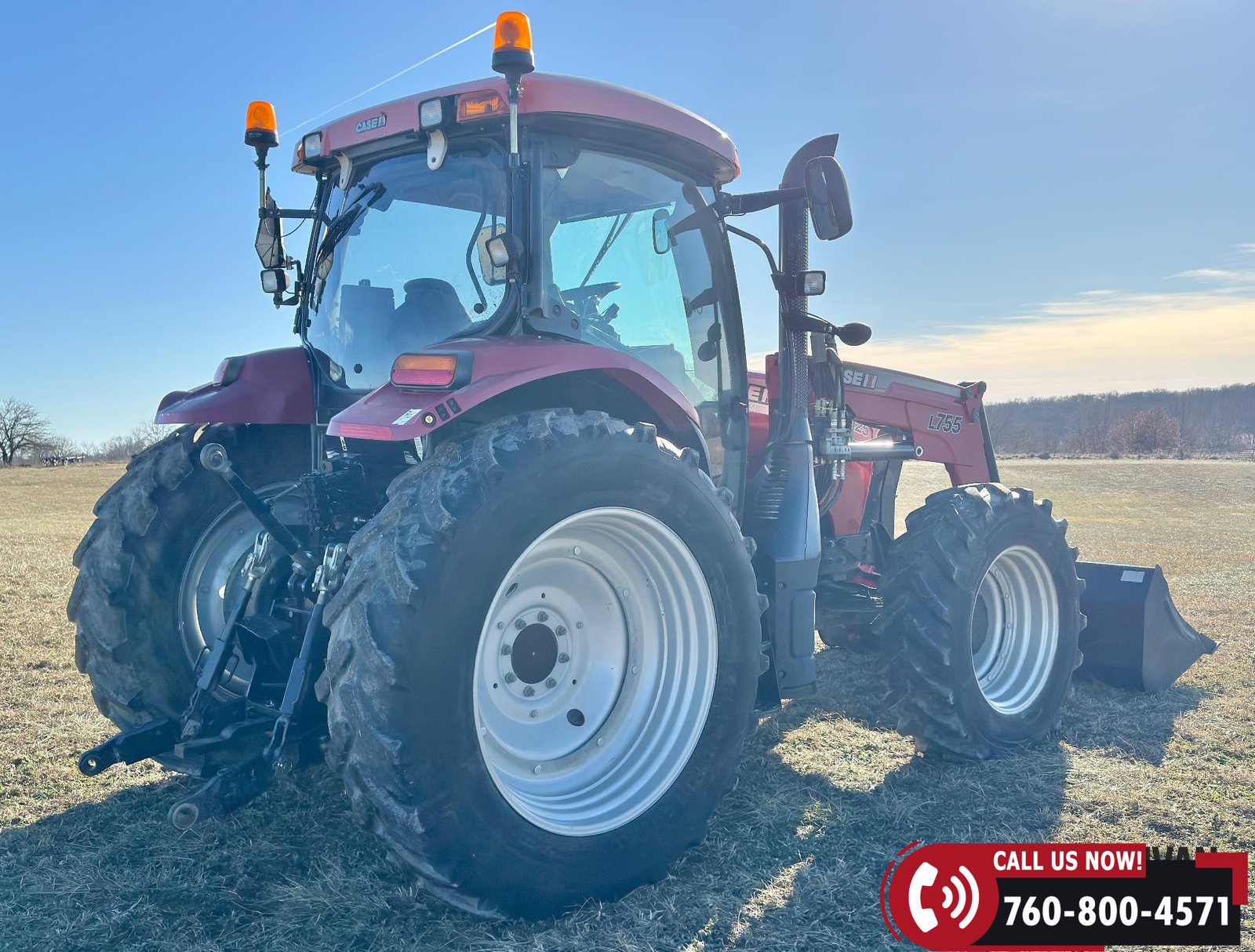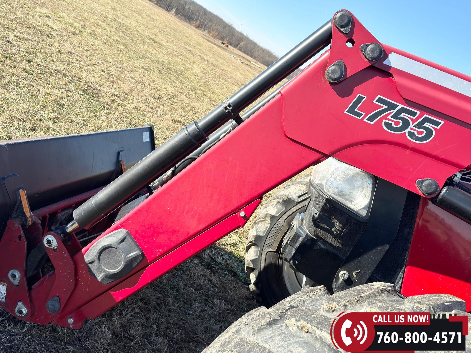 Includes a Case IH L755 loader with mid couplers, joystick control, and a 91″ material bucket with global hookup.