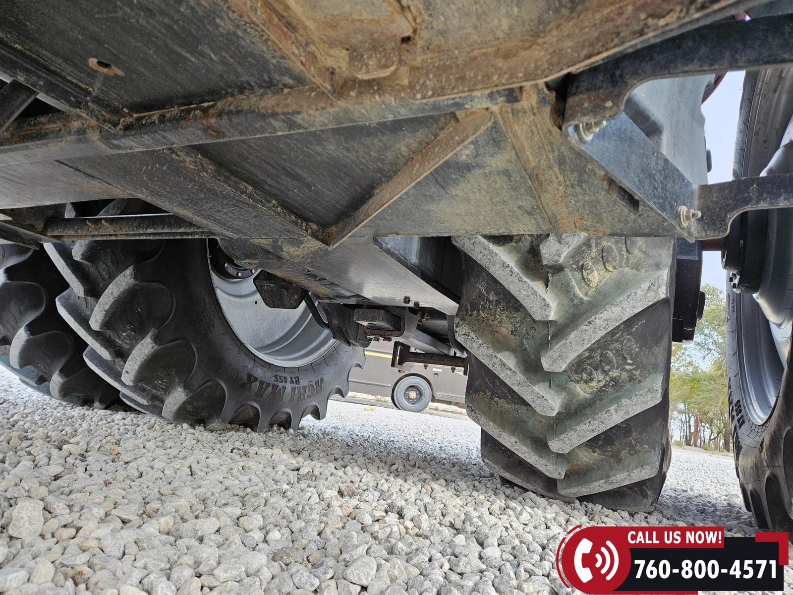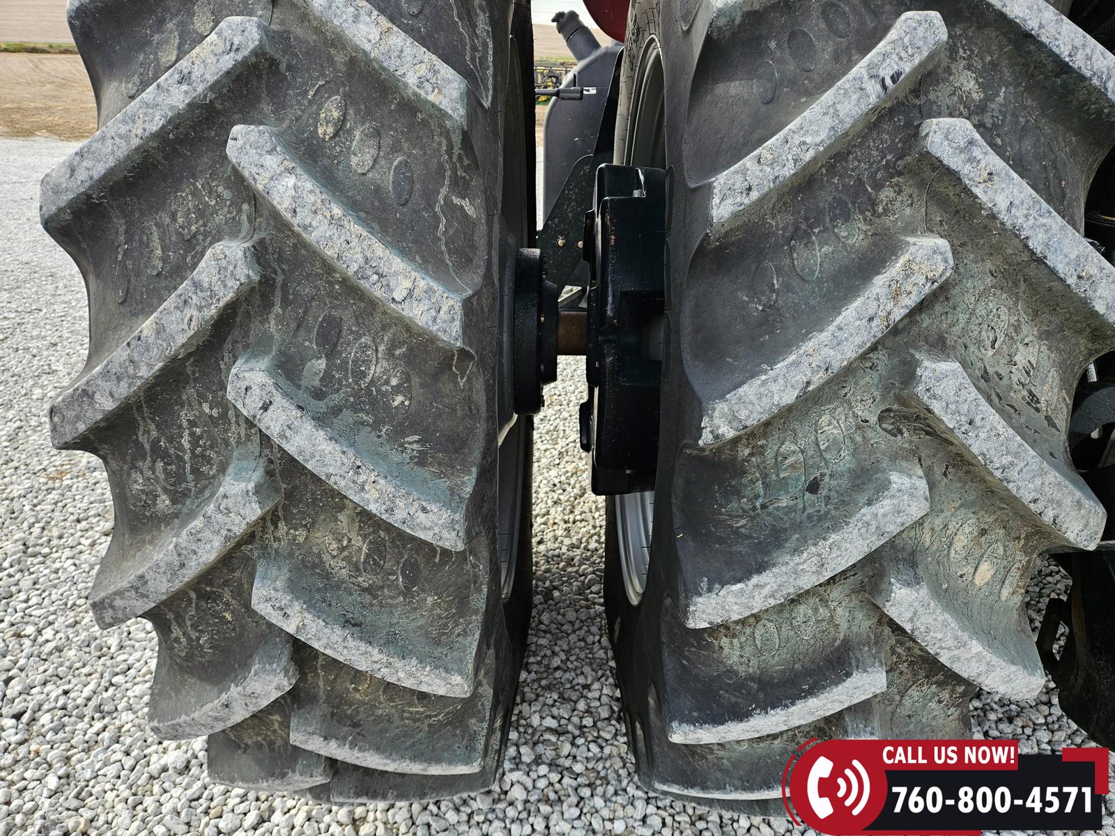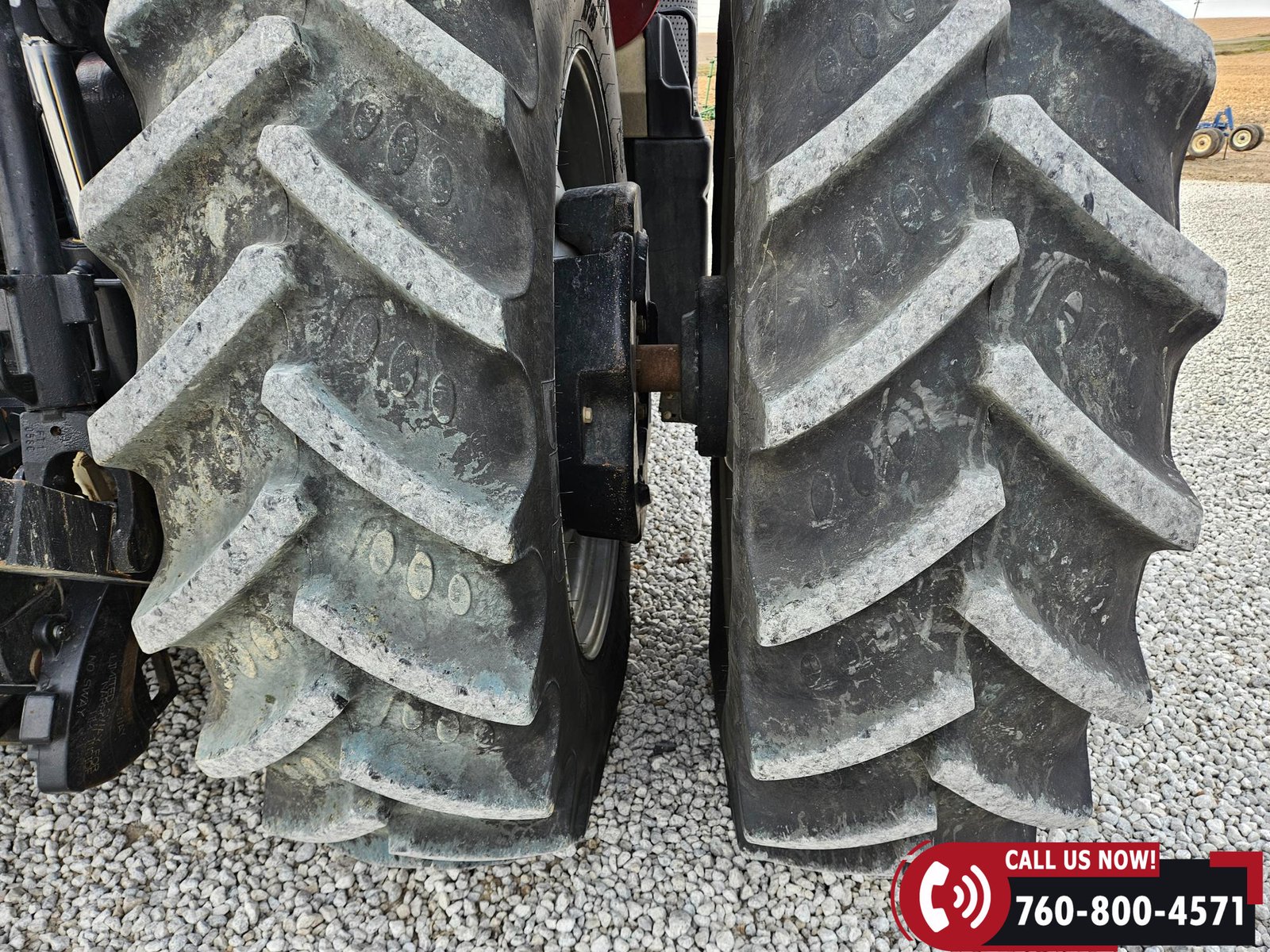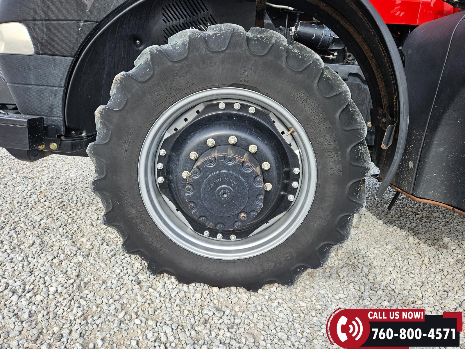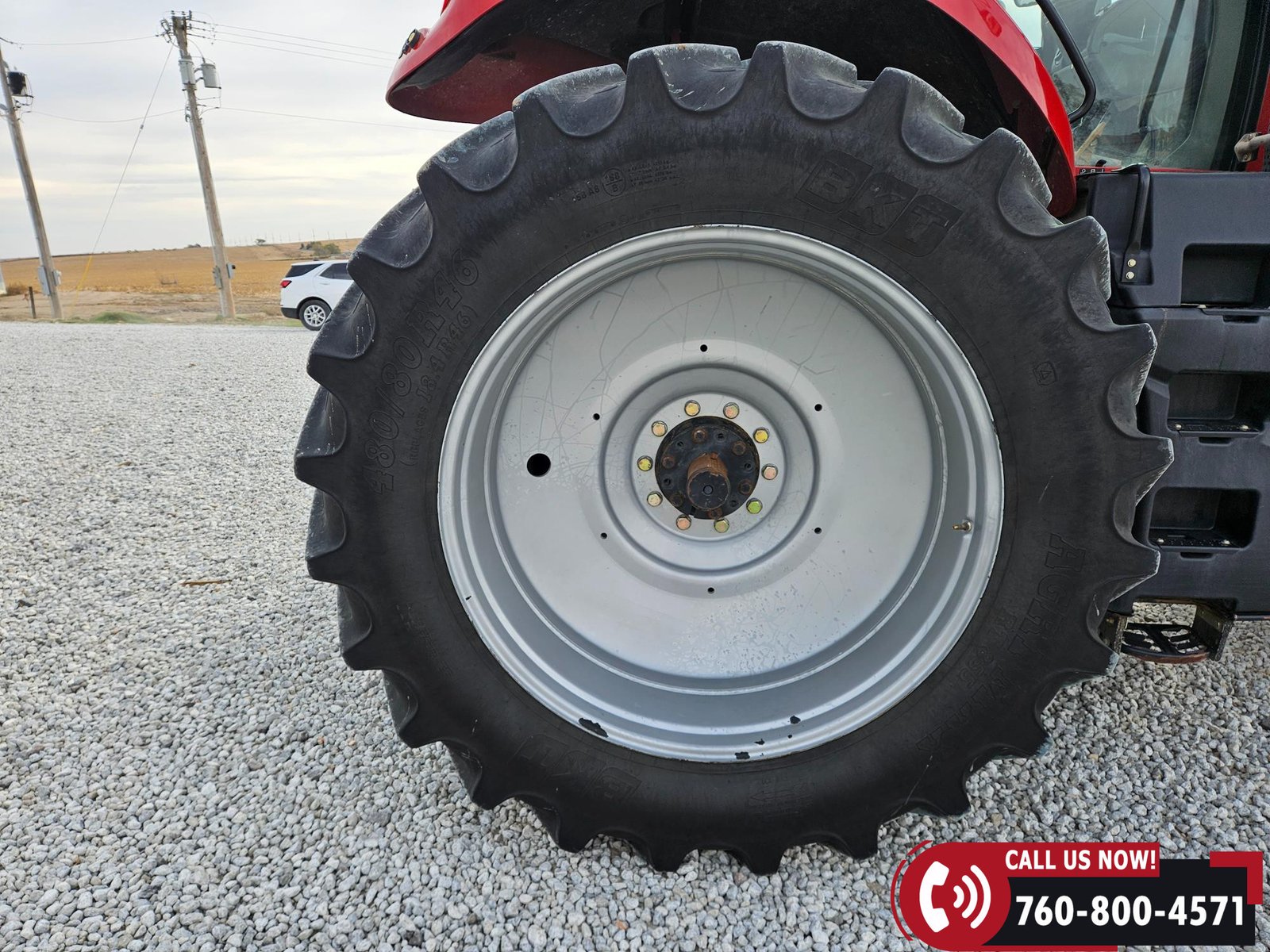 Rides on 380/85R34 front tires and 480/80R46 rear tires with rear duals, set on 30″ row spacing.