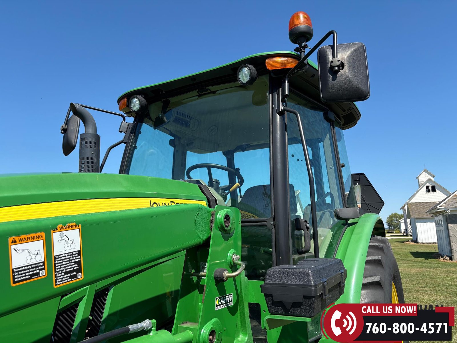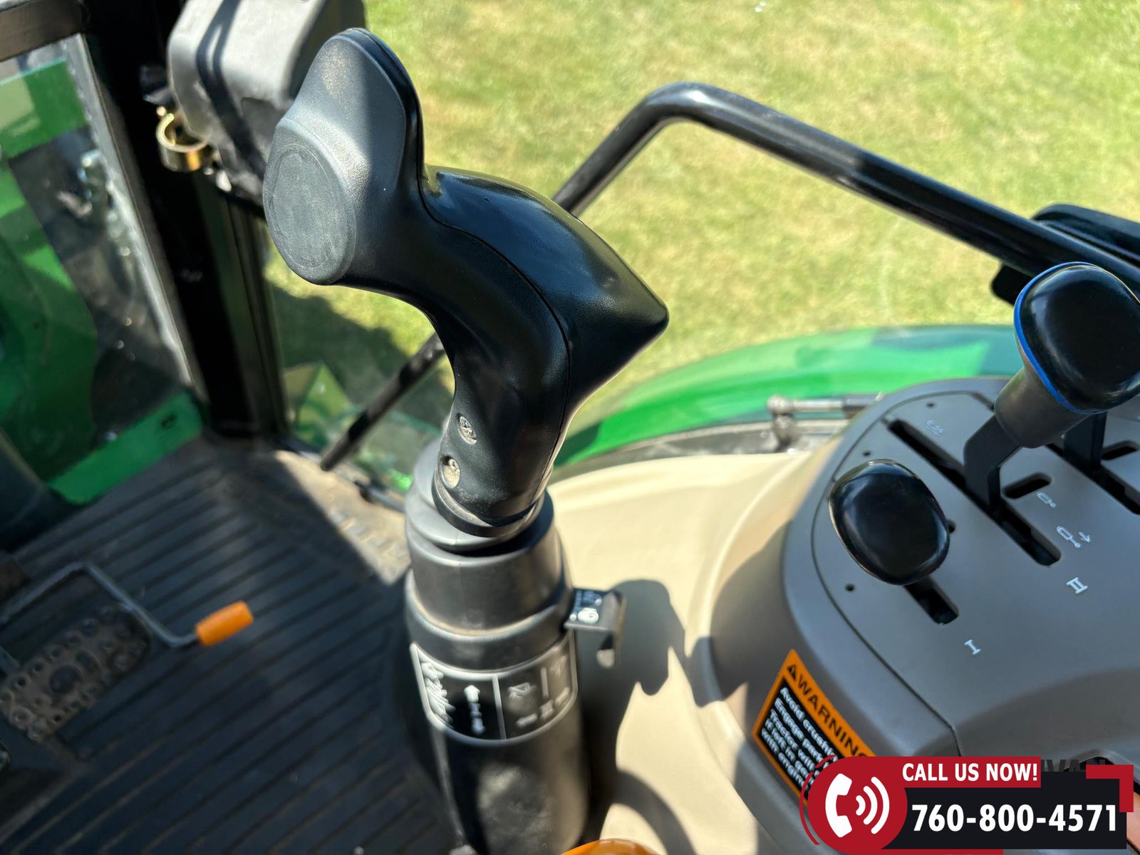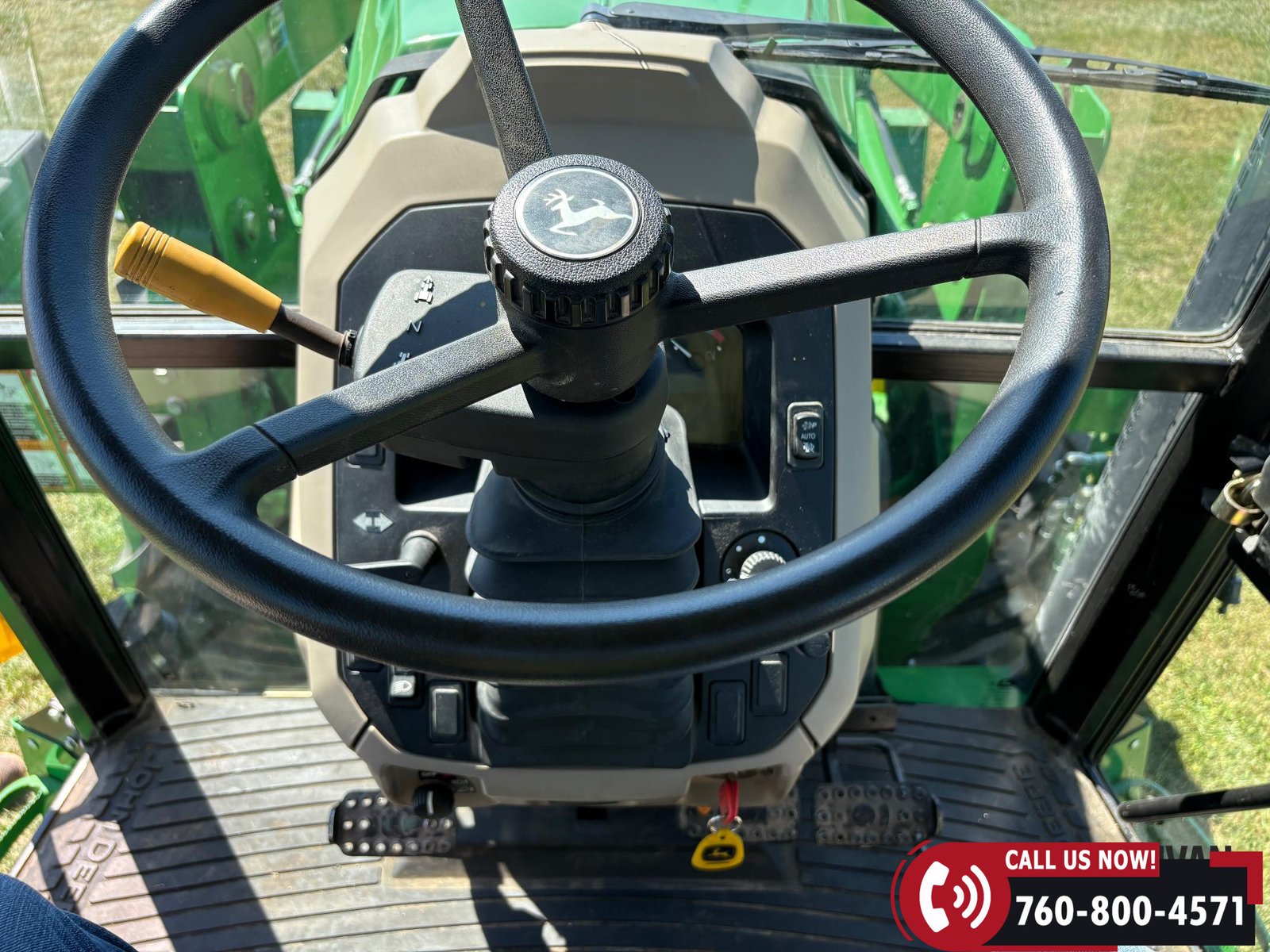 Features include three hydraulic outlets, 540/1000 PTO, and an enclosed cab with right-hand door access. Tractor is also equipped with a joystick control and grille guard.