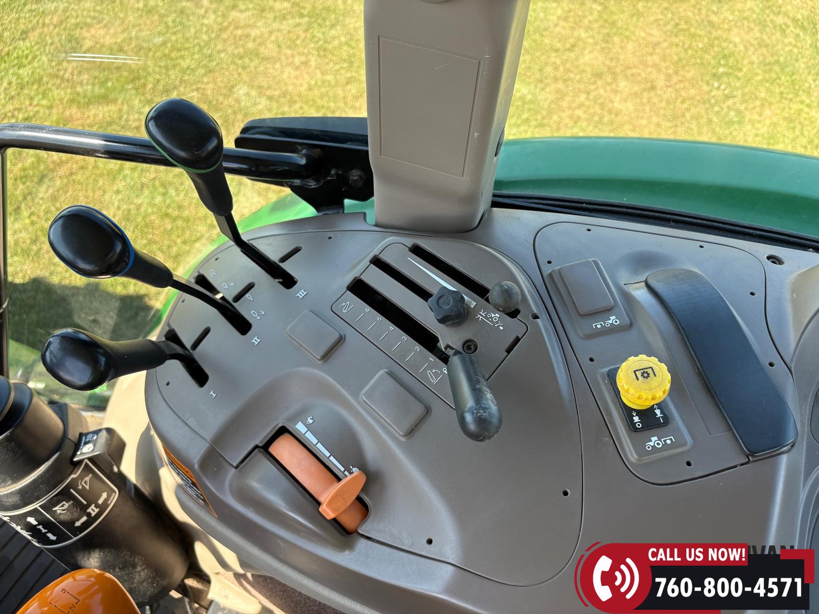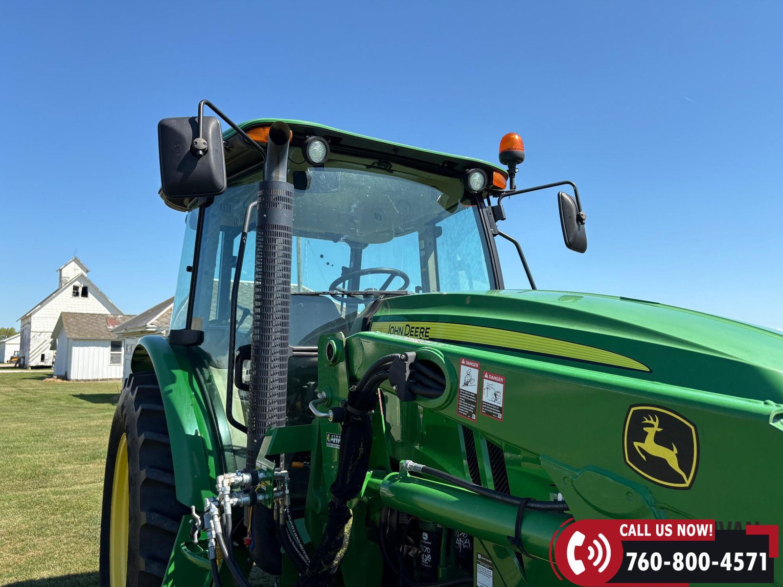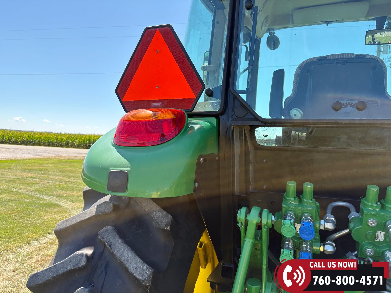 Features include three hydraulic outlets, 540/1000 PTO, and an enclosed cab with right-hand door access. Tractor is also equipped with a joystick control and grille guard.