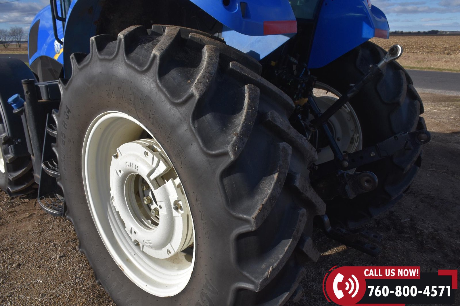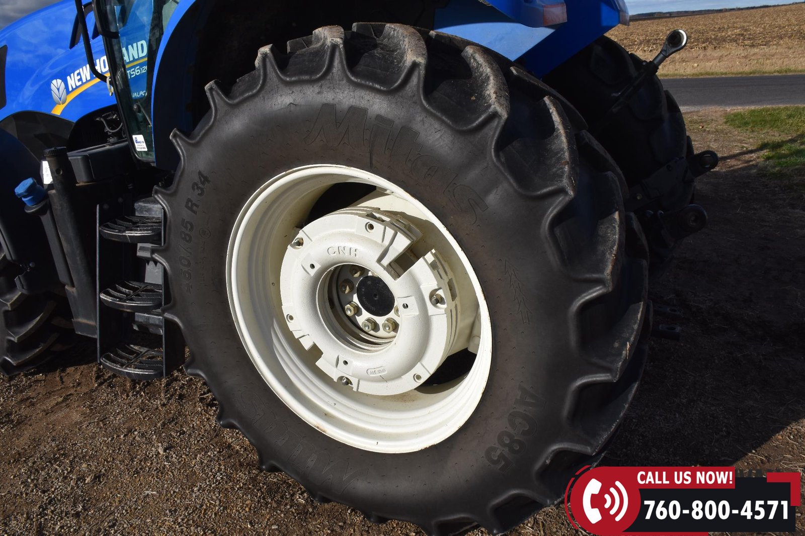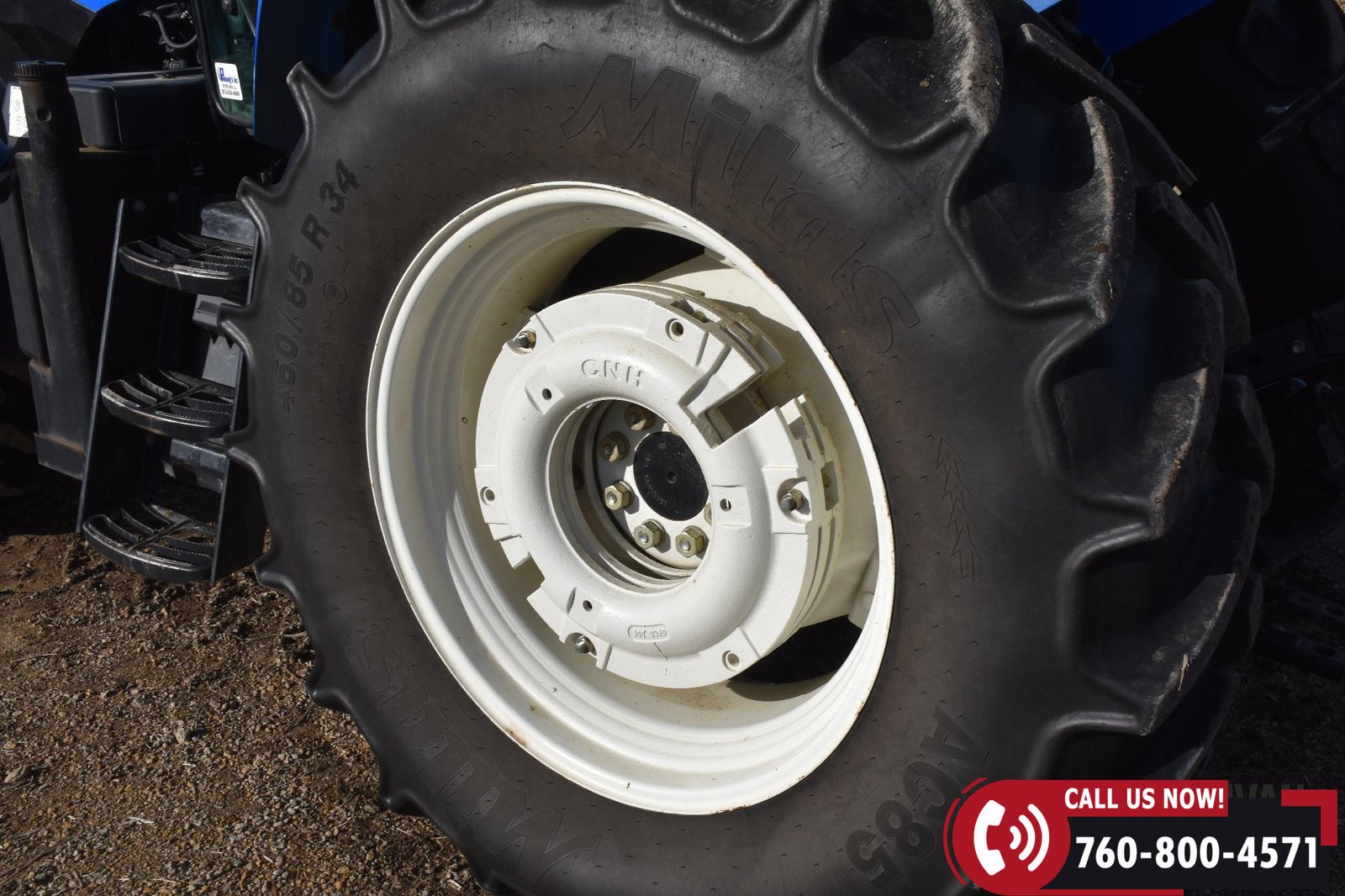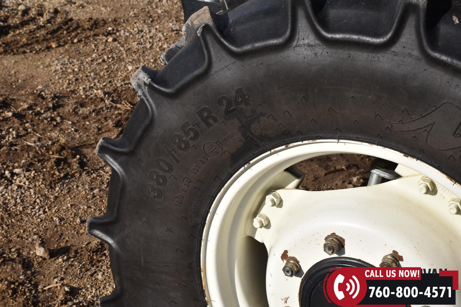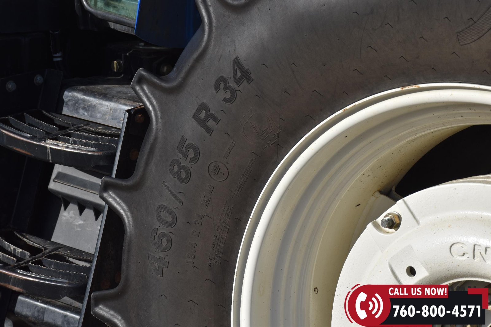 Rides on 380/85R24 front tires and 460/85R34 rear tires.
