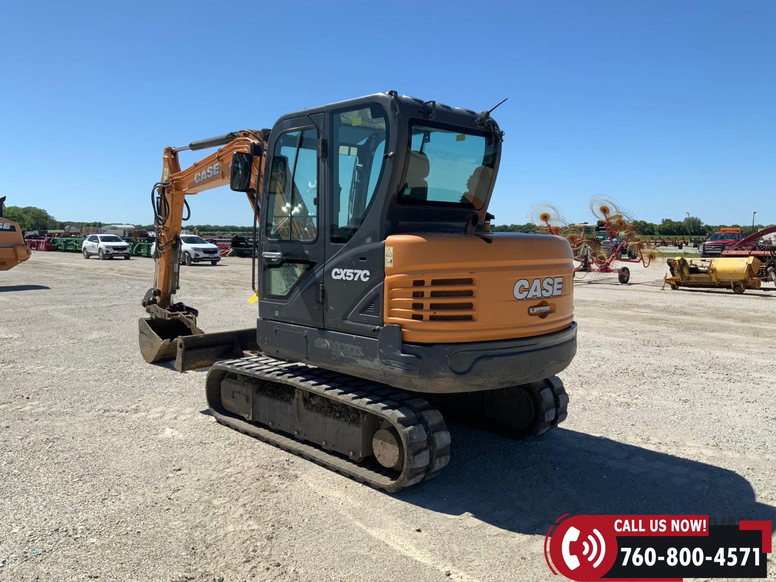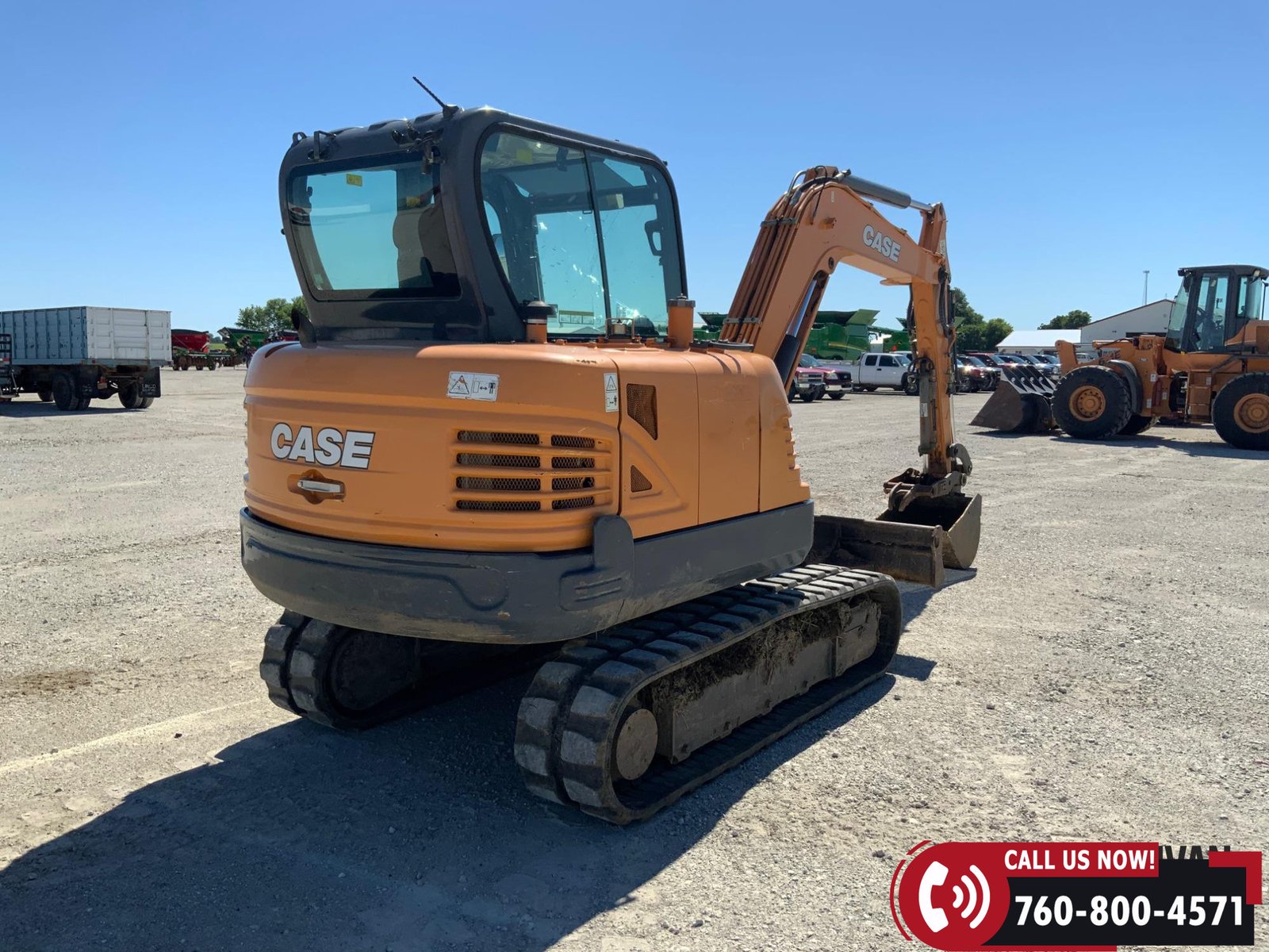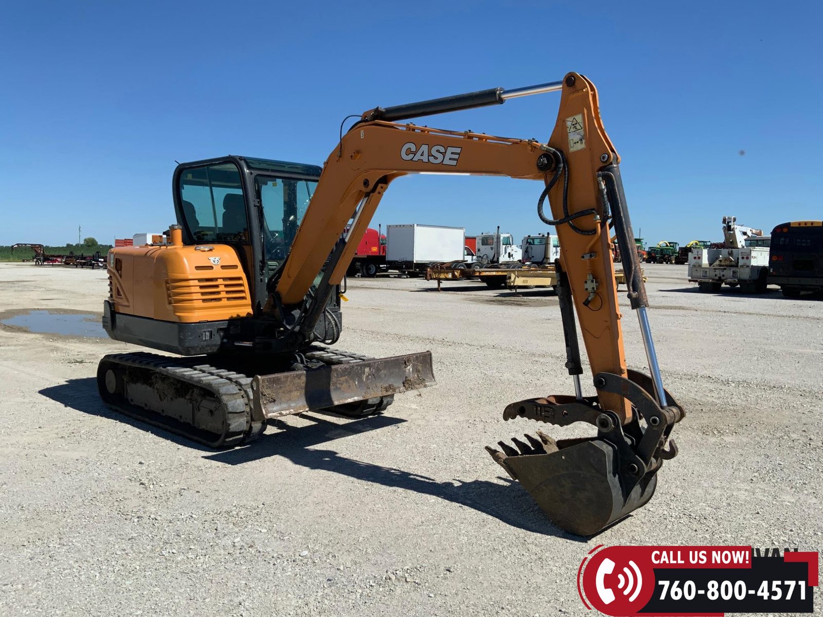 2017 Case CX57C Mini Excavator with 1,722 hours showing. Equipped with an enclosed cab with heat and A/C for operator comfort. Features include auxiliary hydraulics, a 75″ backfill blade, hydraulic thumb, and a 24″ bucket for versatile digging and material handling. Rides on 16″ rubber tracks. A reliable, job-ready mini excavator ideal for construction and utility work.