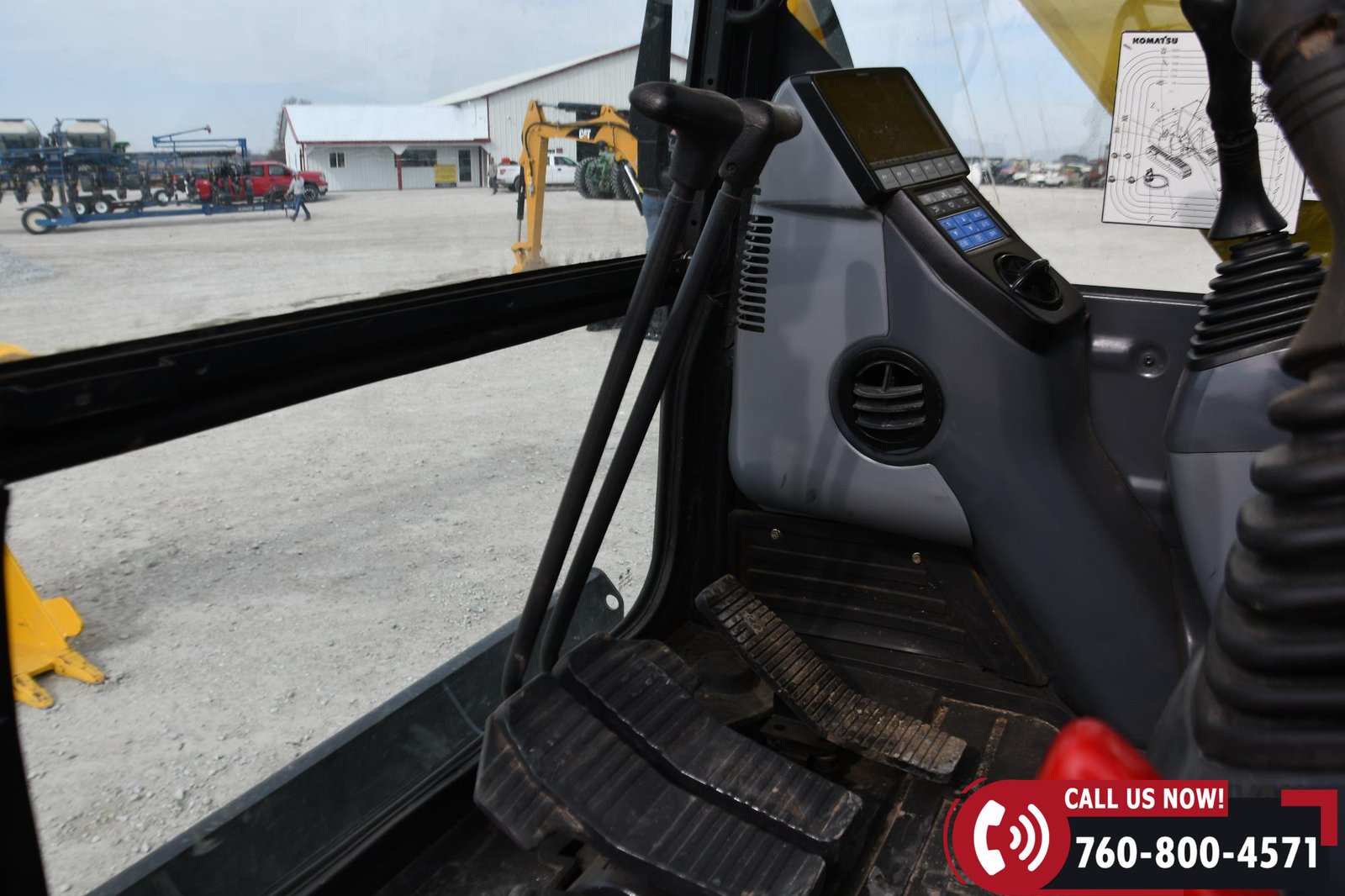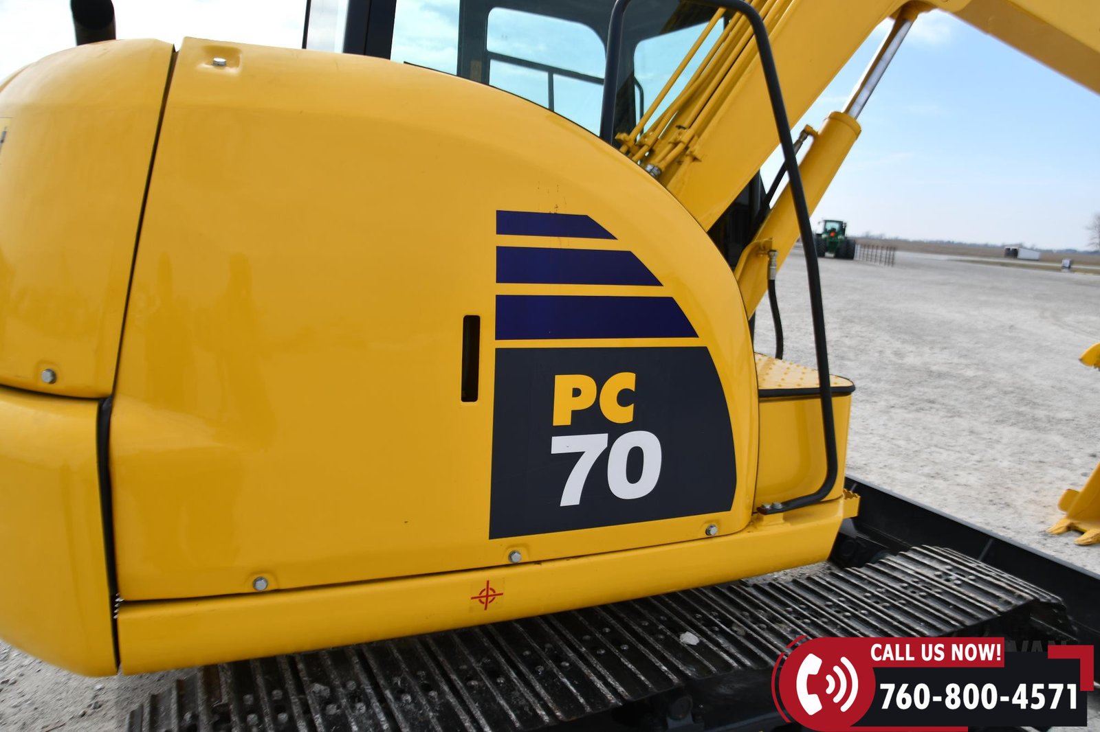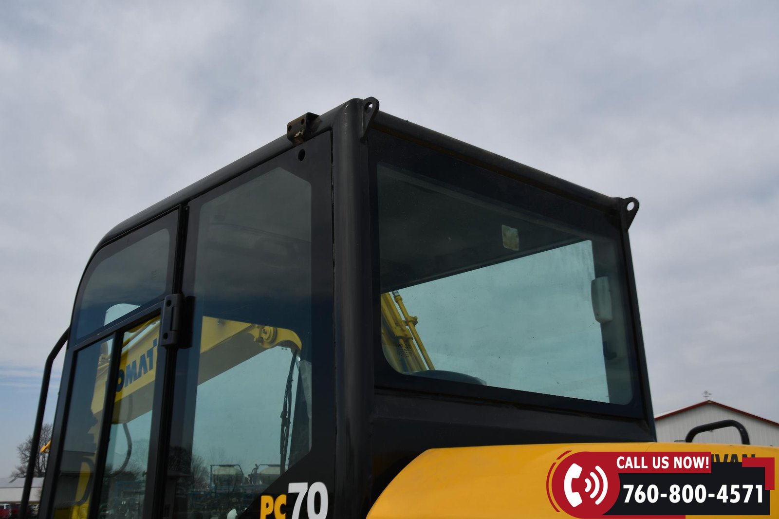 2018 Komatsu PC70-8 Excavator with 791 hours showing. Equipped with an enclosed cab with heat and A/C for operator comfort. Features include an 88″ backfill blade, hydraulic thumb, and a 32″ bucket for efficient digging and material handling. Rides on 17″ tracks. A low-hour, versatile excavator ready for construction or utility work.