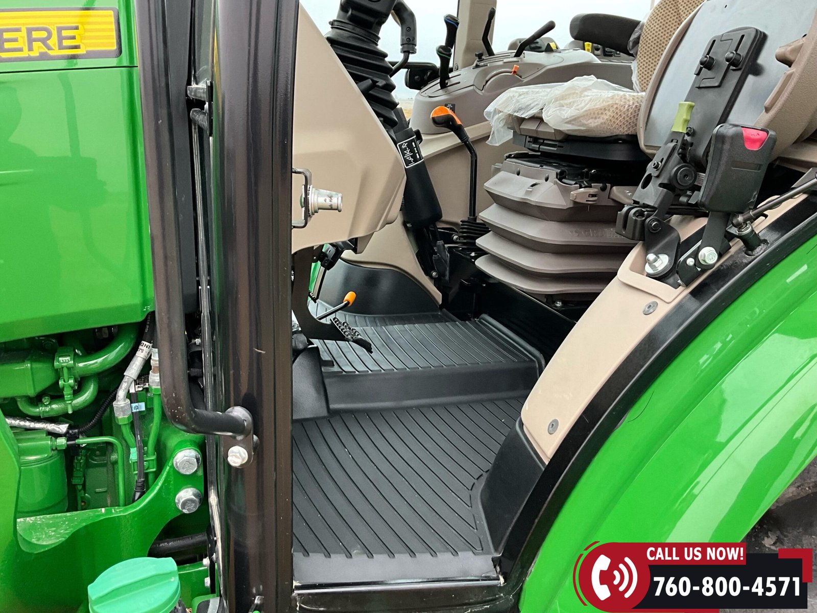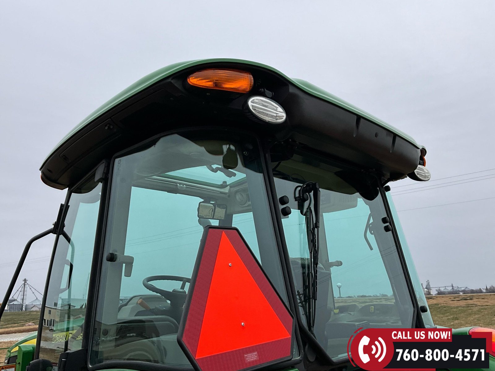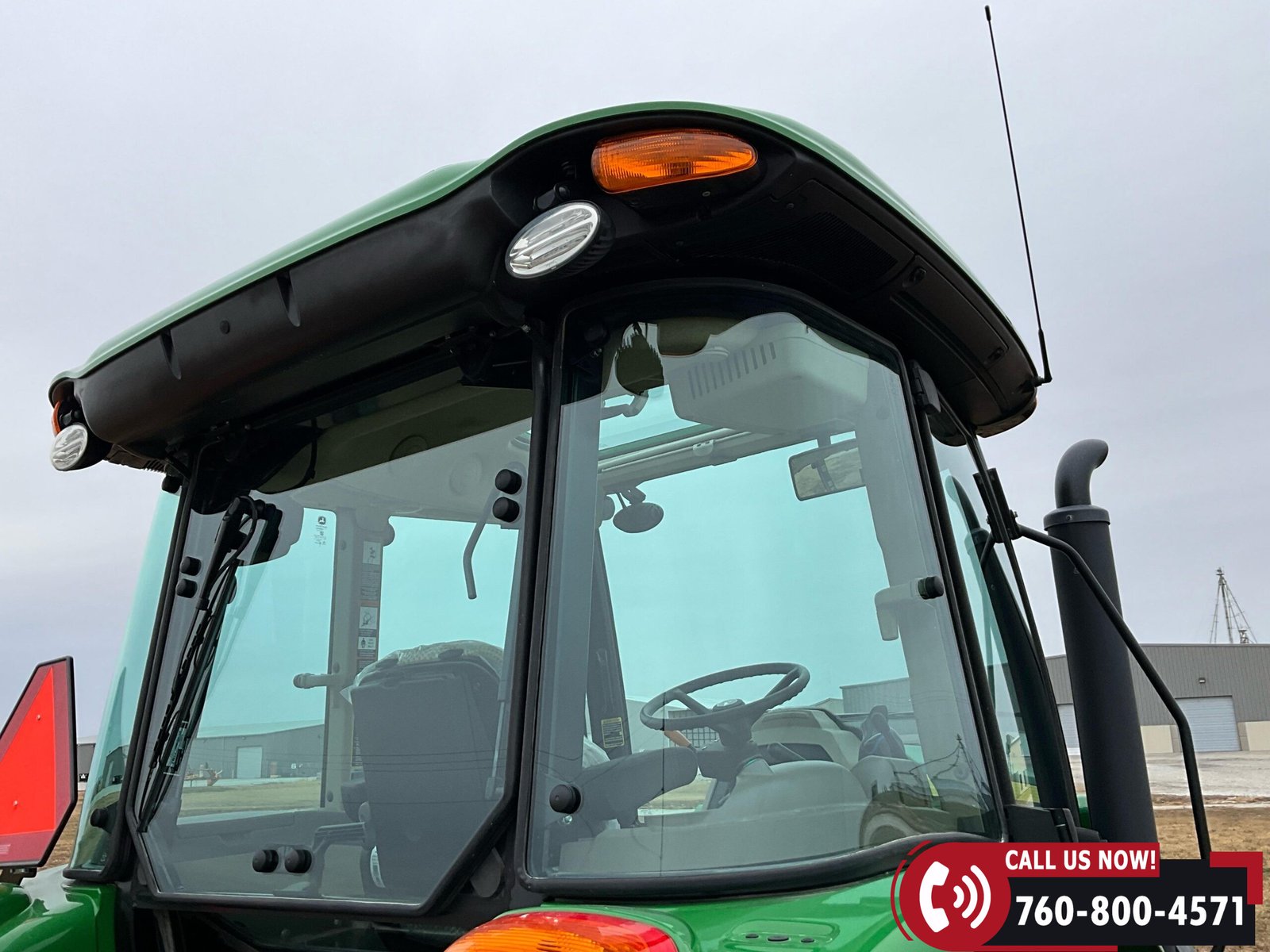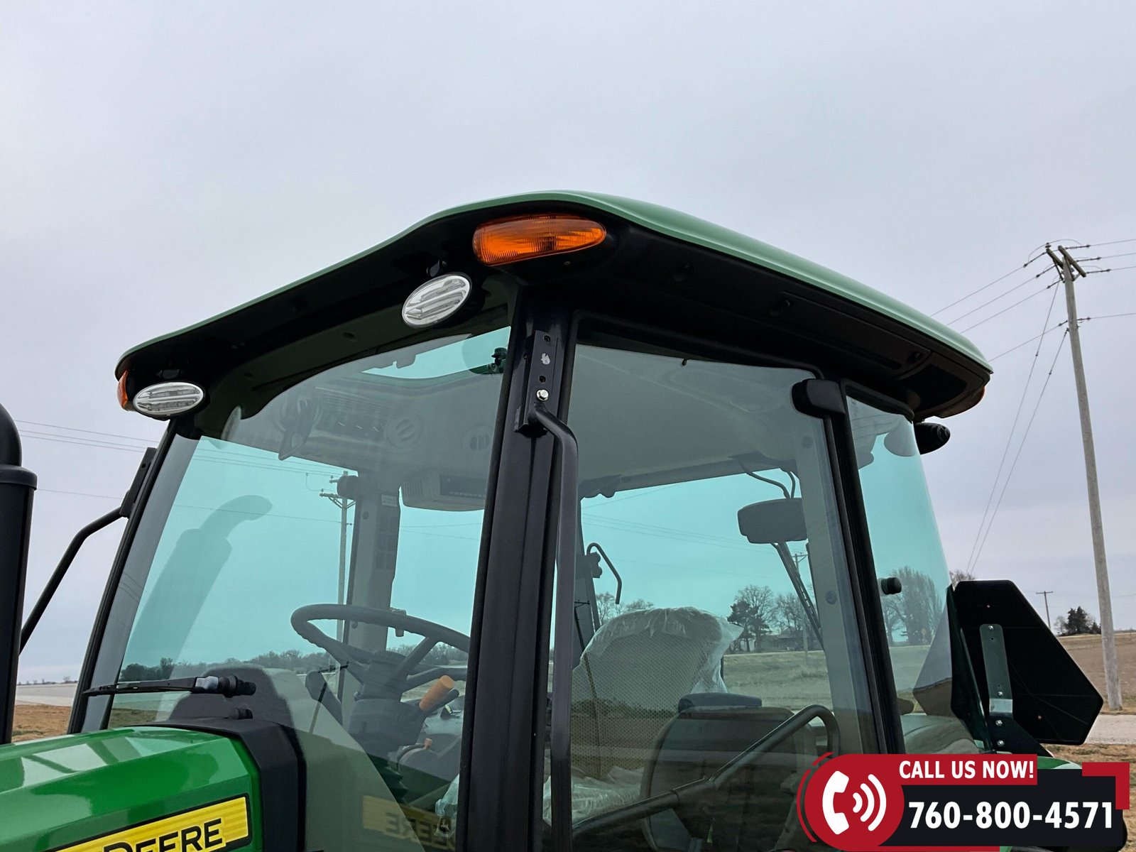Cab is fully enclosed with two doors and includes an air ride operator seat, buddy seat, heat and A/C, AM/FM/USB/Aux/Bluetooth radio, tilt steering, hand and foot throttle, sun roof, sun shade, rearview mirror, front and rear wipers, LED lighting, toolbox, and operator’s manuals. Tractor is also equipped with a front grille guard.