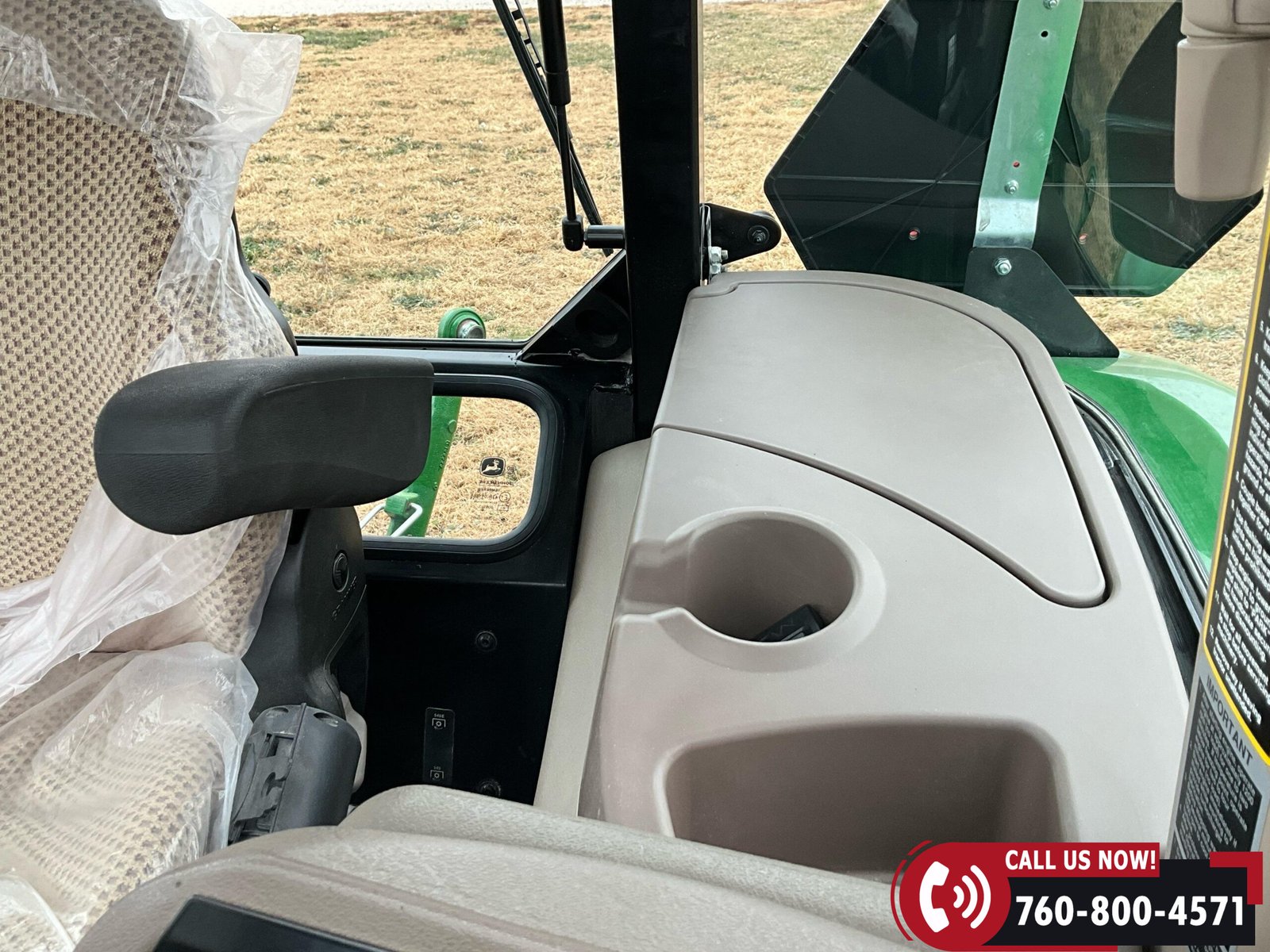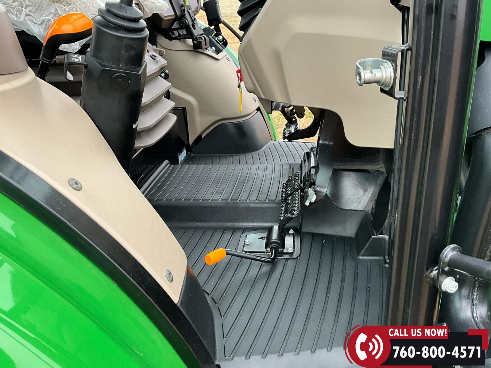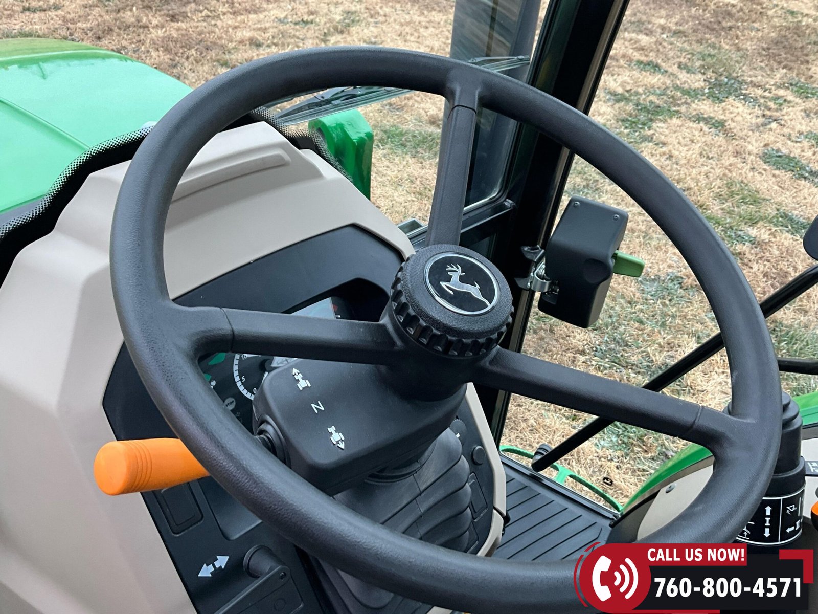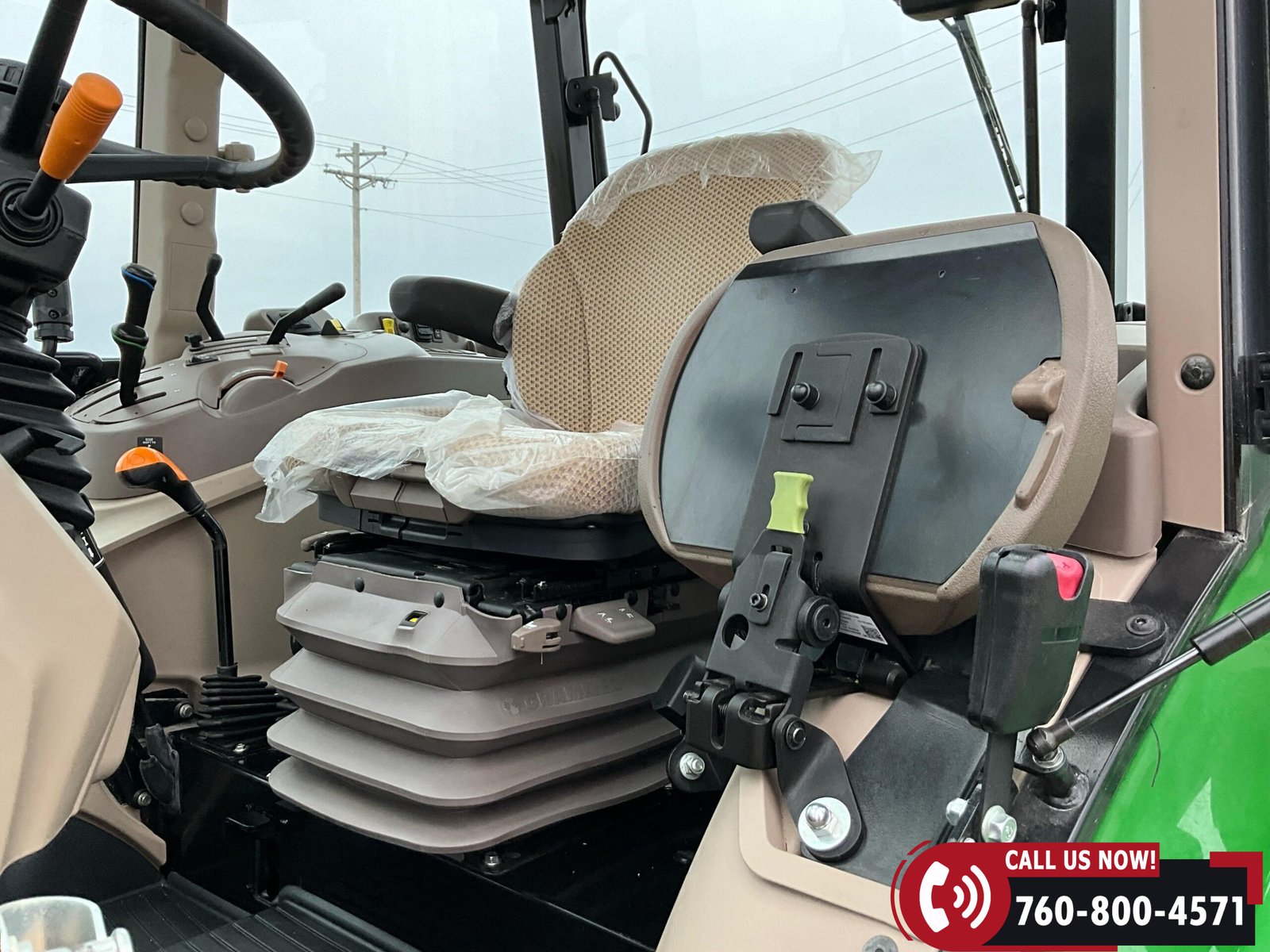 Cab is fully enclosed with two doors and includes an air ride operator seat, buddy seat, heat and A/C, AM/FM/USB/Aux/Bluetooth radio, tilt steering, hand and foot throttle, sun roof, sun shade, rearview mirror, front and rear wipers, LED lighting, toolbox, and operator’s manuals. Tractor is also equipped with a front grille guard.