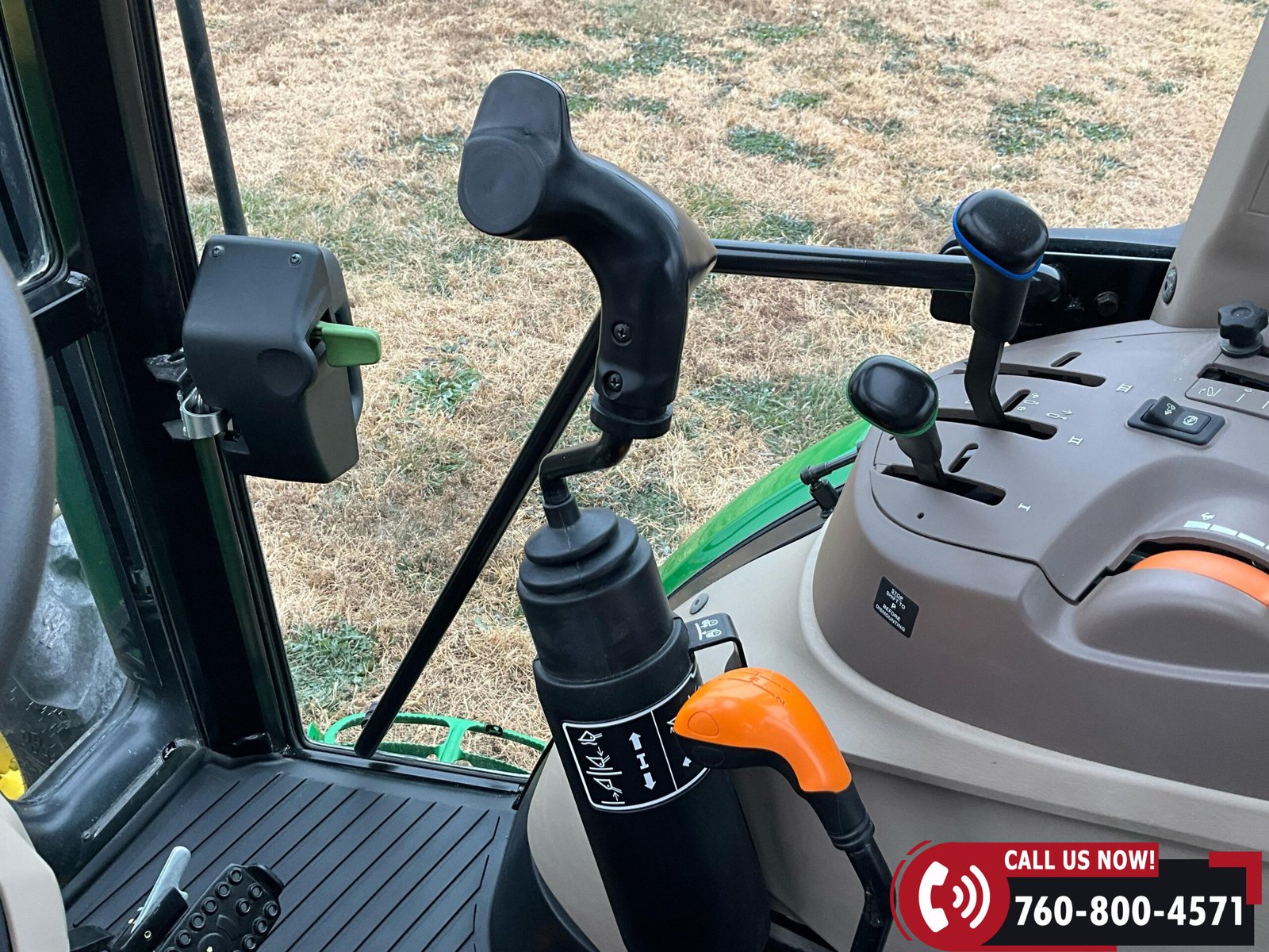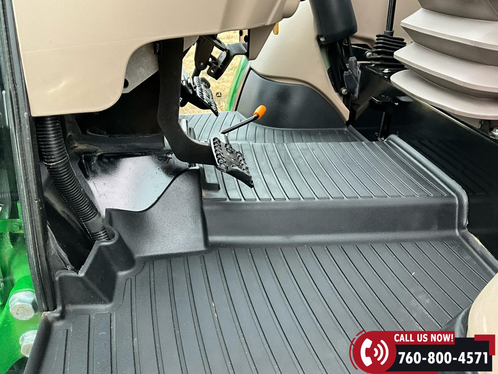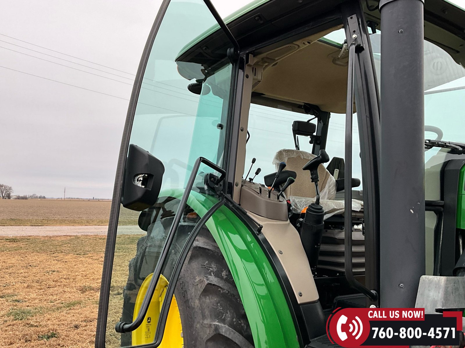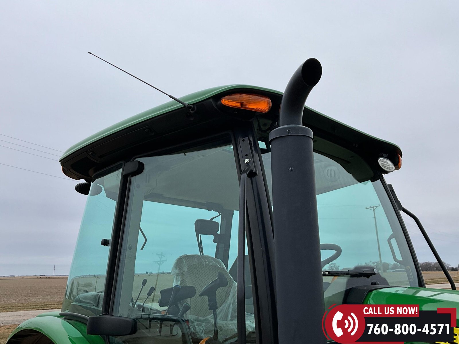 Cab is fully enclosed with two doors and includes an air ride operator seat, buddy seat, heat and A/C, AM/FM/USB/Aux/Bluetooth radio, tilt steering, hand and foot throttle, sun roof, sun shade, rearview mirror, front and rear wipers, LED lighting, toolbox, and operator’s manuals. Tractor is also equipped with a front grille guard.