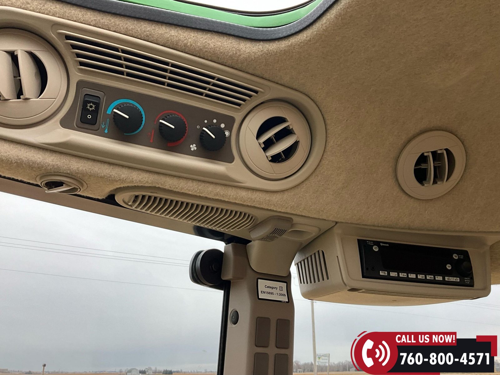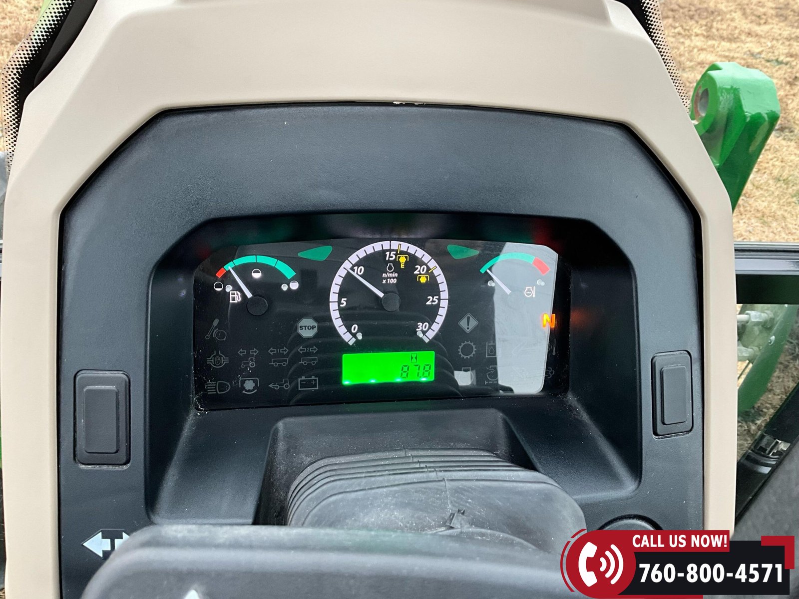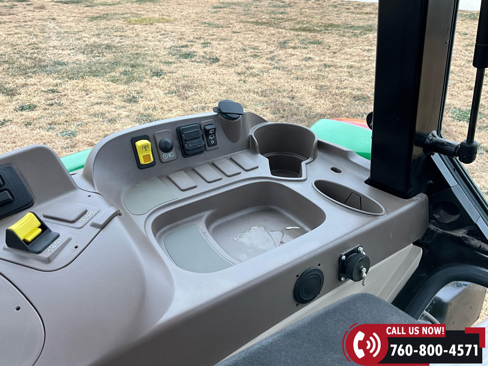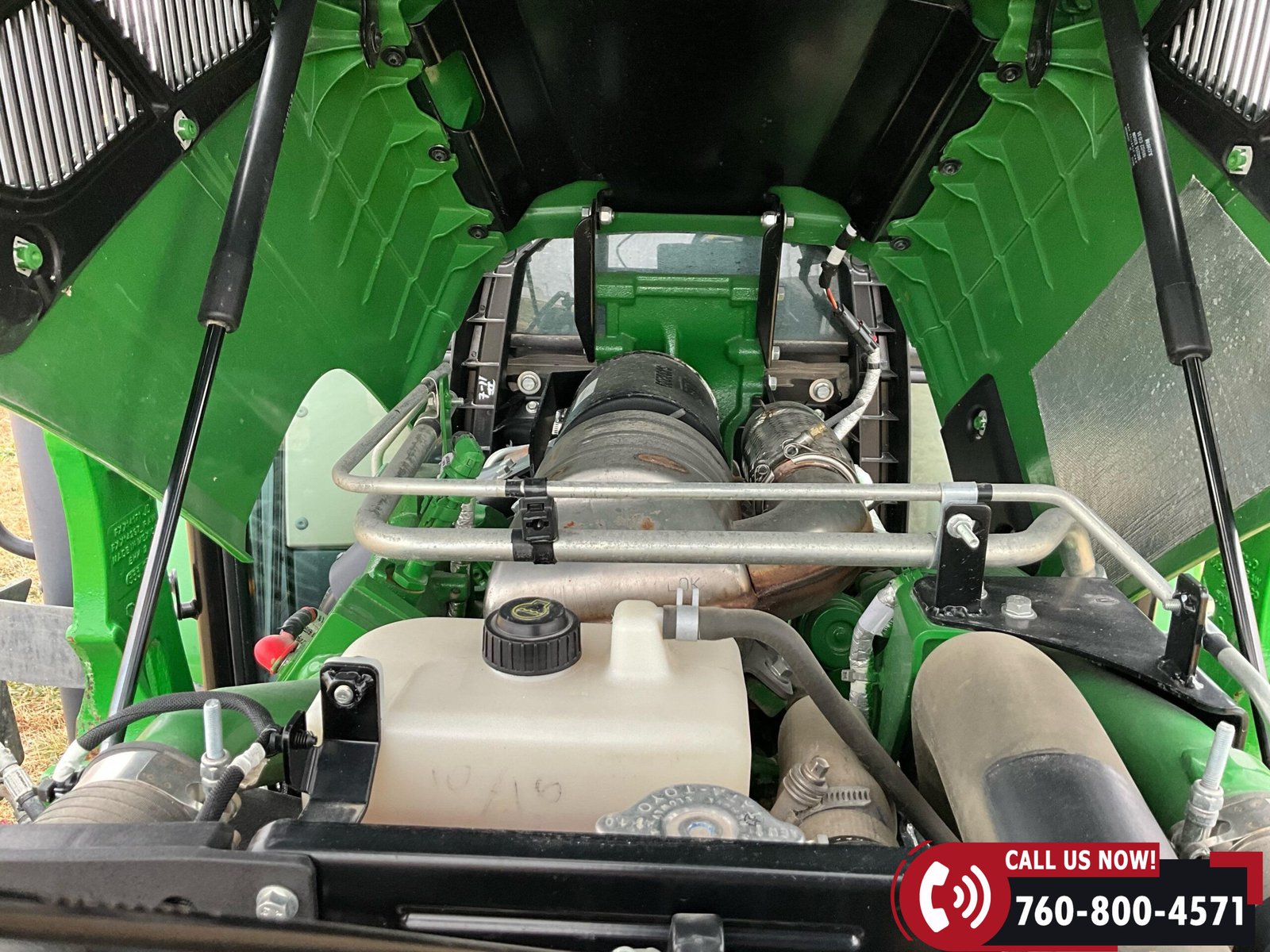 Cab is fully enclosed with two doors and includes an air ride operator seat, buddy seat, heat and A/C, AM/FM/USB/Aux/Bluetooth radio, tilt steering, hand and foot throttle, sun roof, sun shade, rearview mirror, front and rear wipers, LED lighting, toolbox, and operator’s manuals. Tractor is also equipped with a front grille guard.