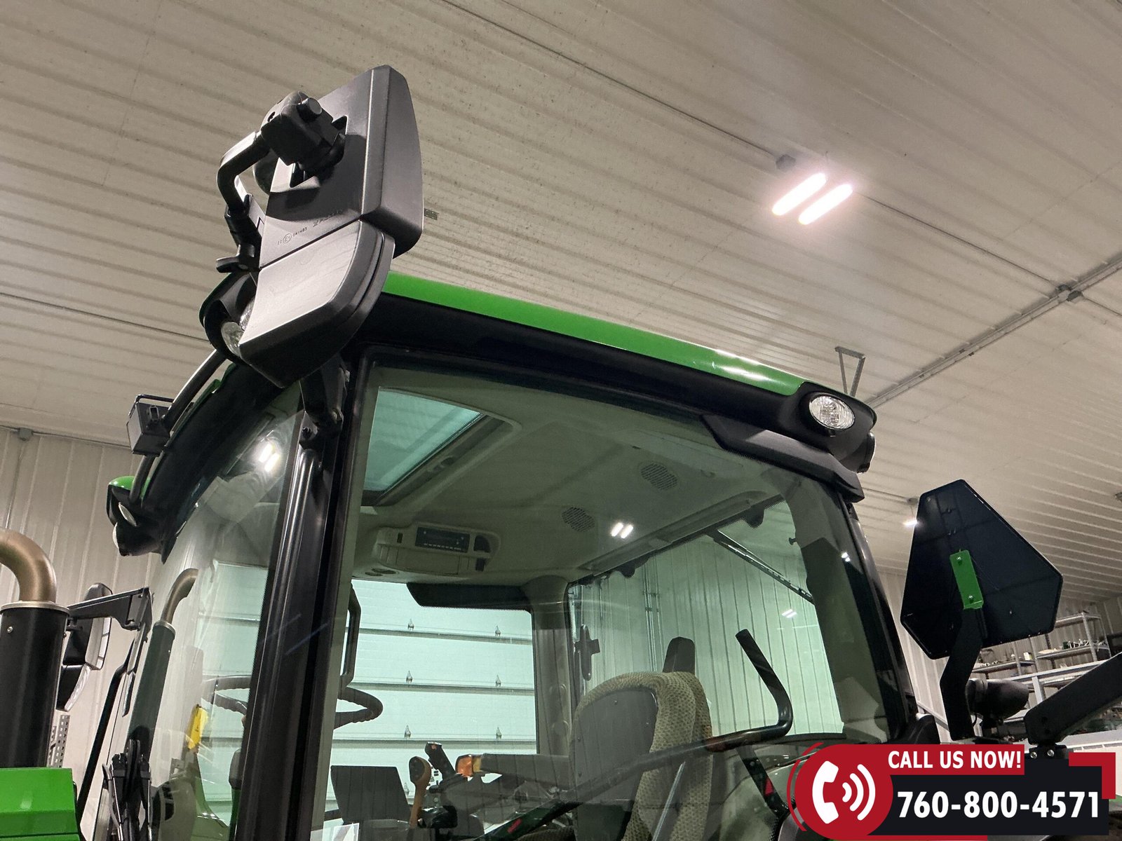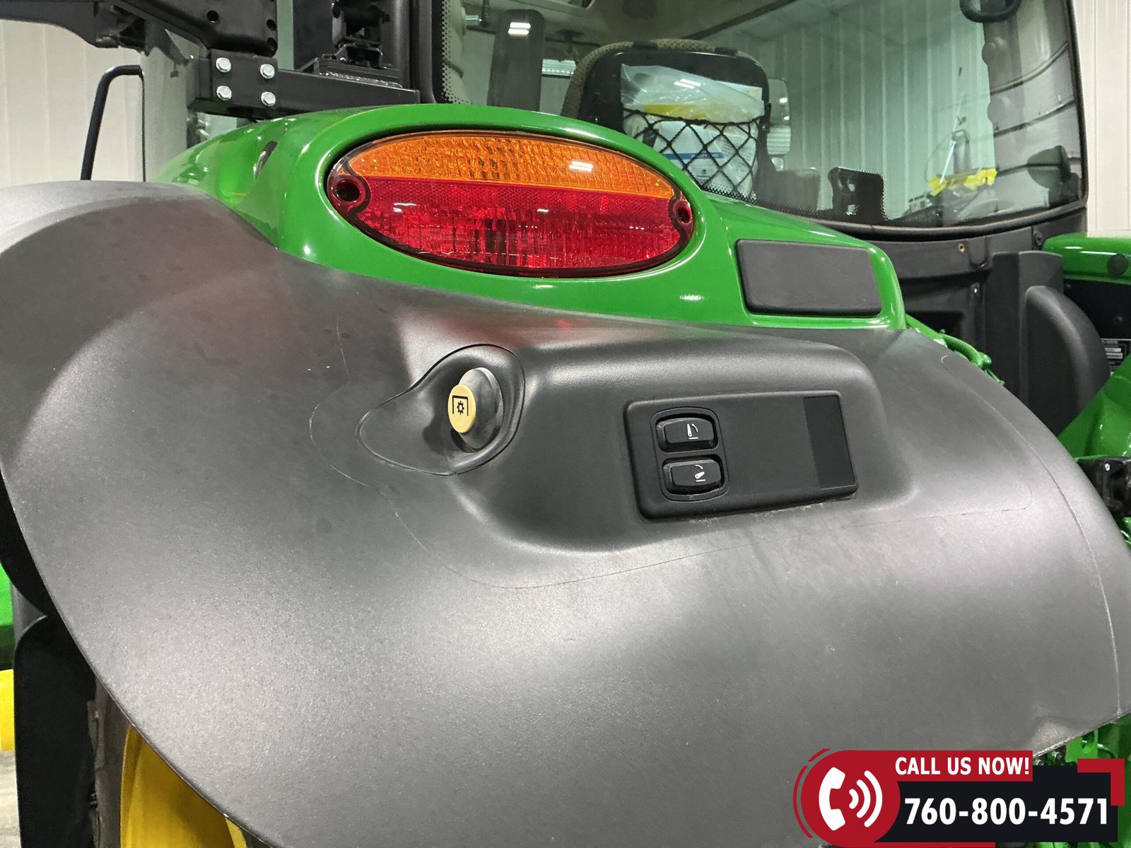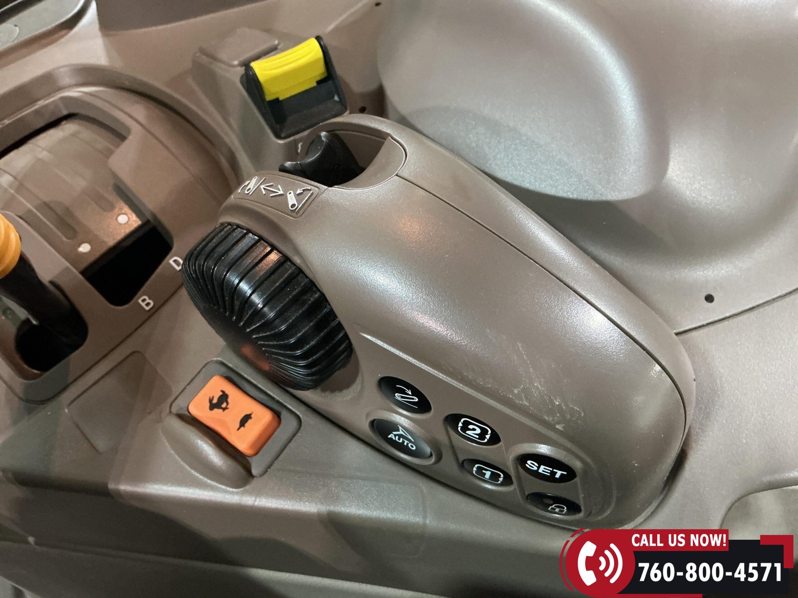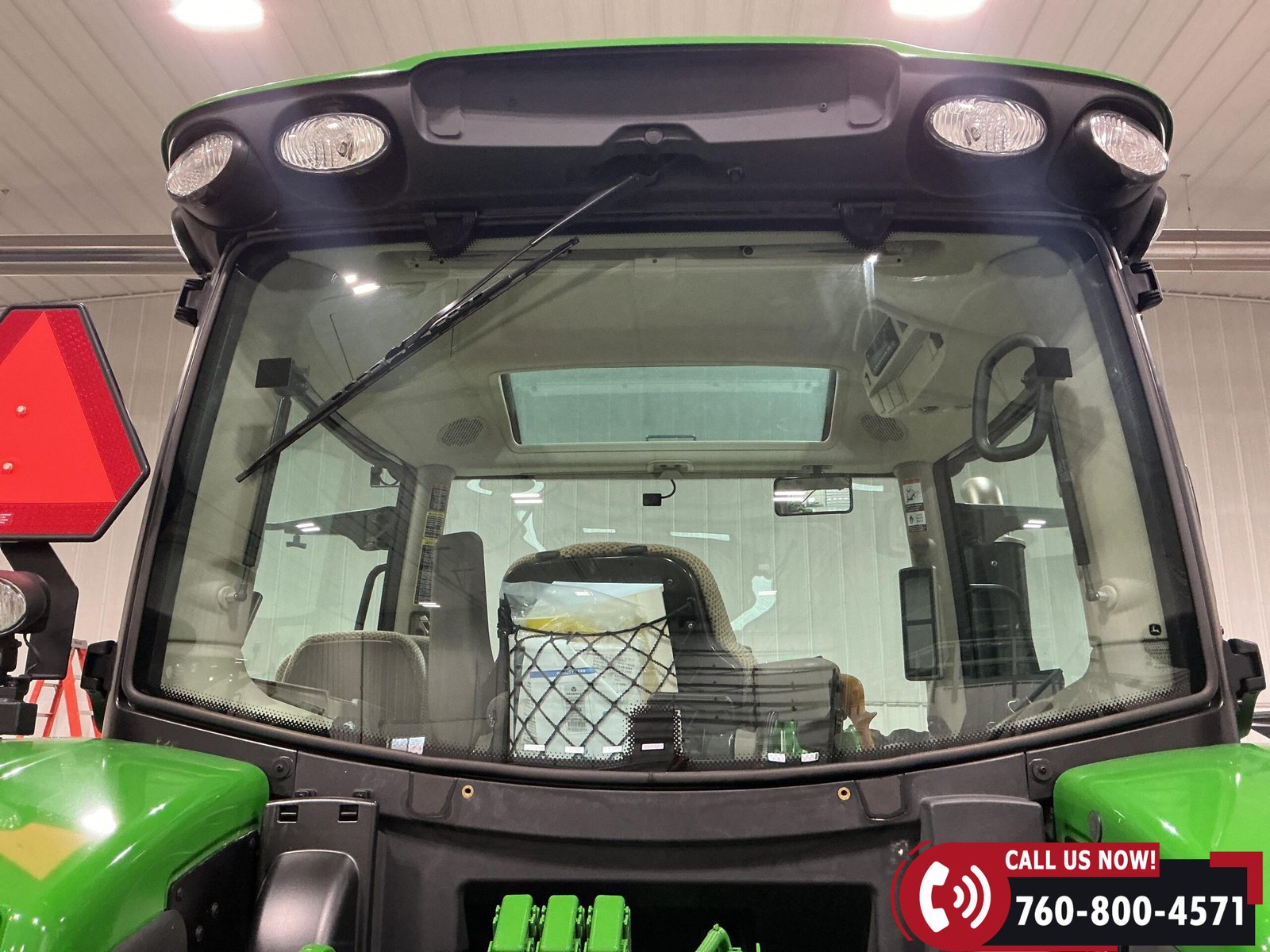 Features include front axle suspension, three hydraulic remotes, 540/1000 PTO, rear fender PTO and 3-point hitch controls, extendable 3-point arms, and a drawbar with hammer strap. Tractor is also equipped with a 110 kg starter front weight bracket and cab skylight.