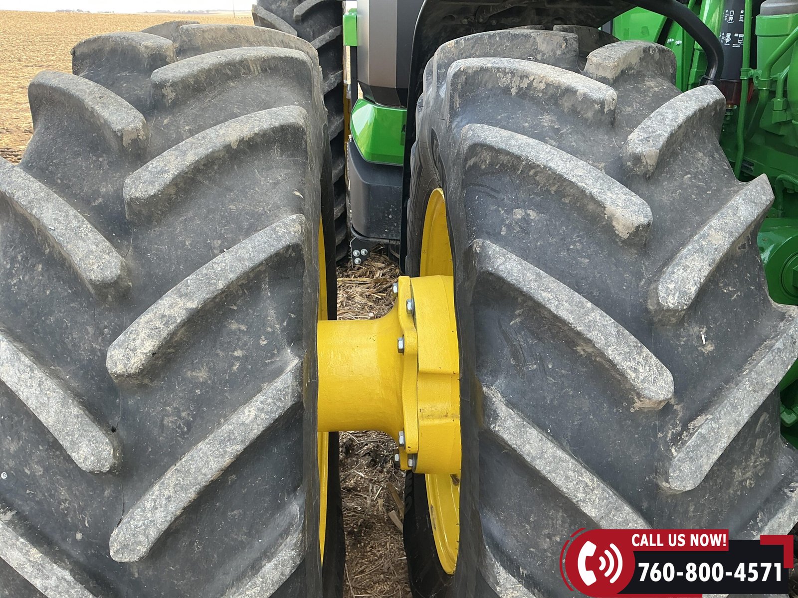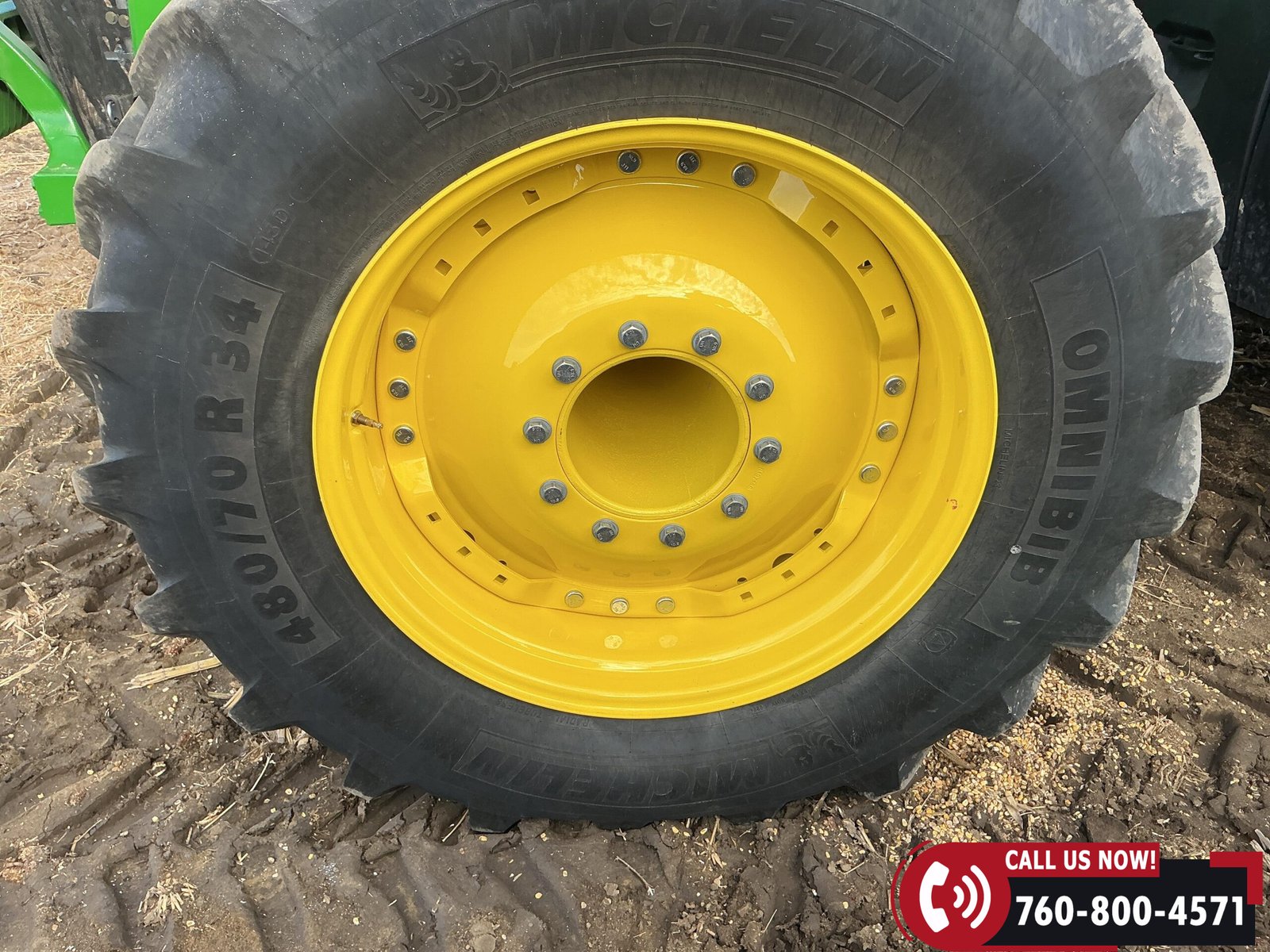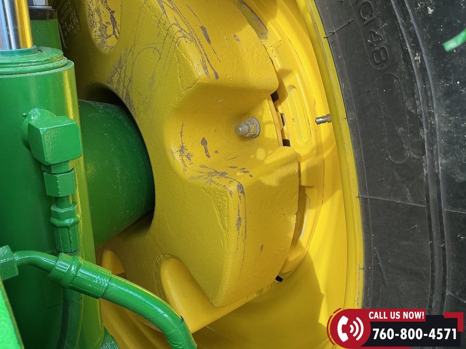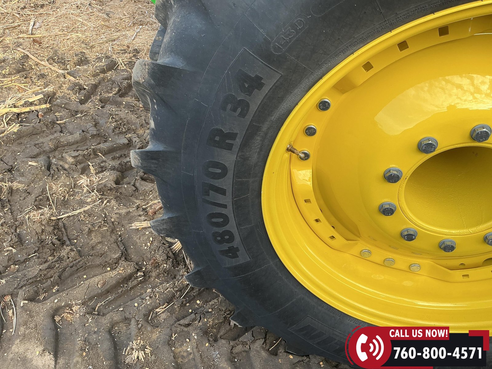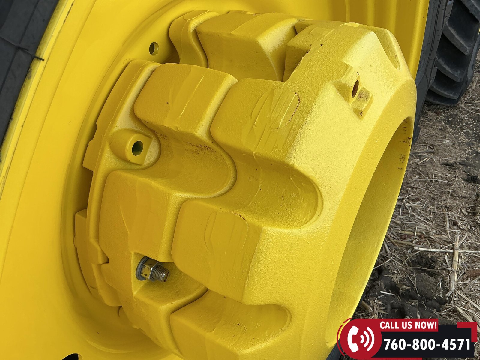 Rides on 480/70R34 front tires with duals and 480/80R50 rear tires with duals. Rear wheels include (4) outer 205 kg (452 lb) weights and (2) inner 625 kg (1,377 lb) weights, totaling 4,562 lbs of rear wheel weight.