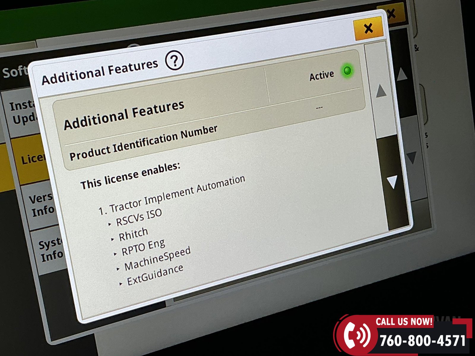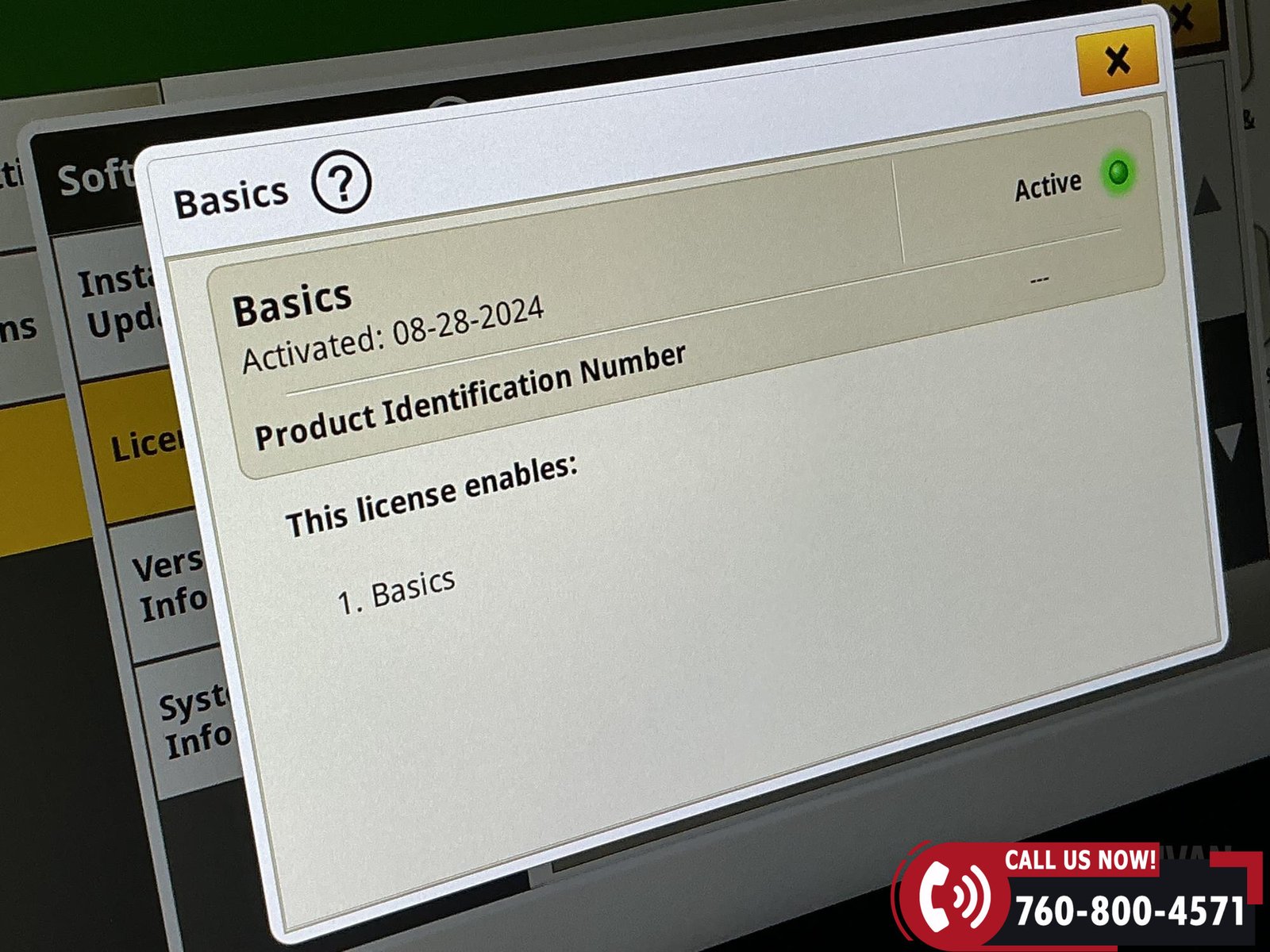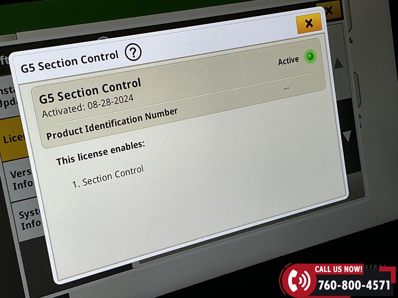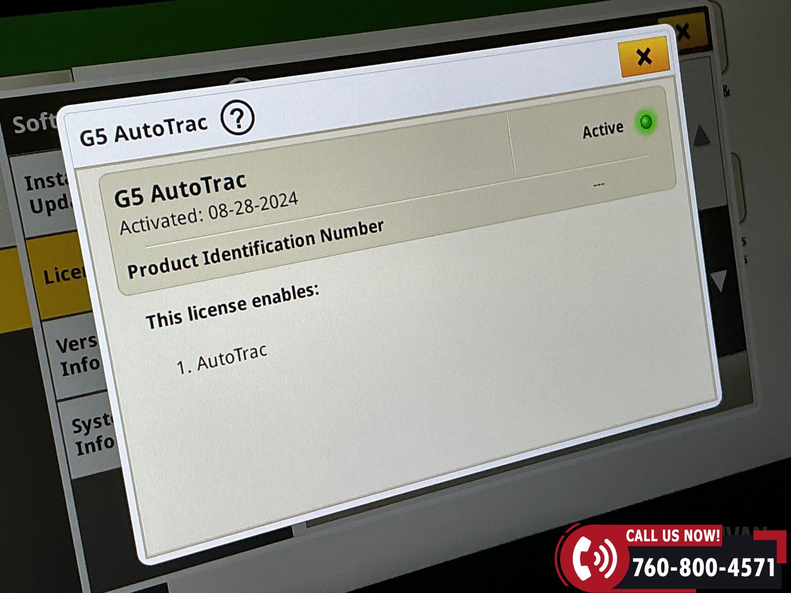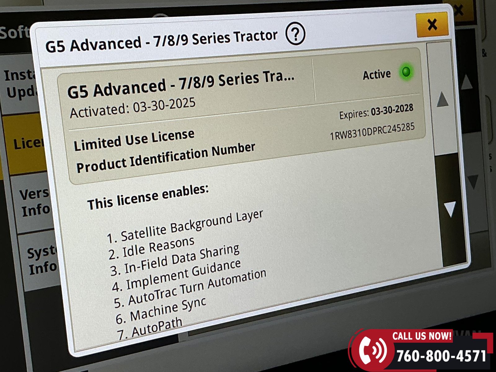 Technology package includes G5 Advanced activations (7/8/9) valid through 03/30/2028, along with Basics, AutoTrac, and Section Control.